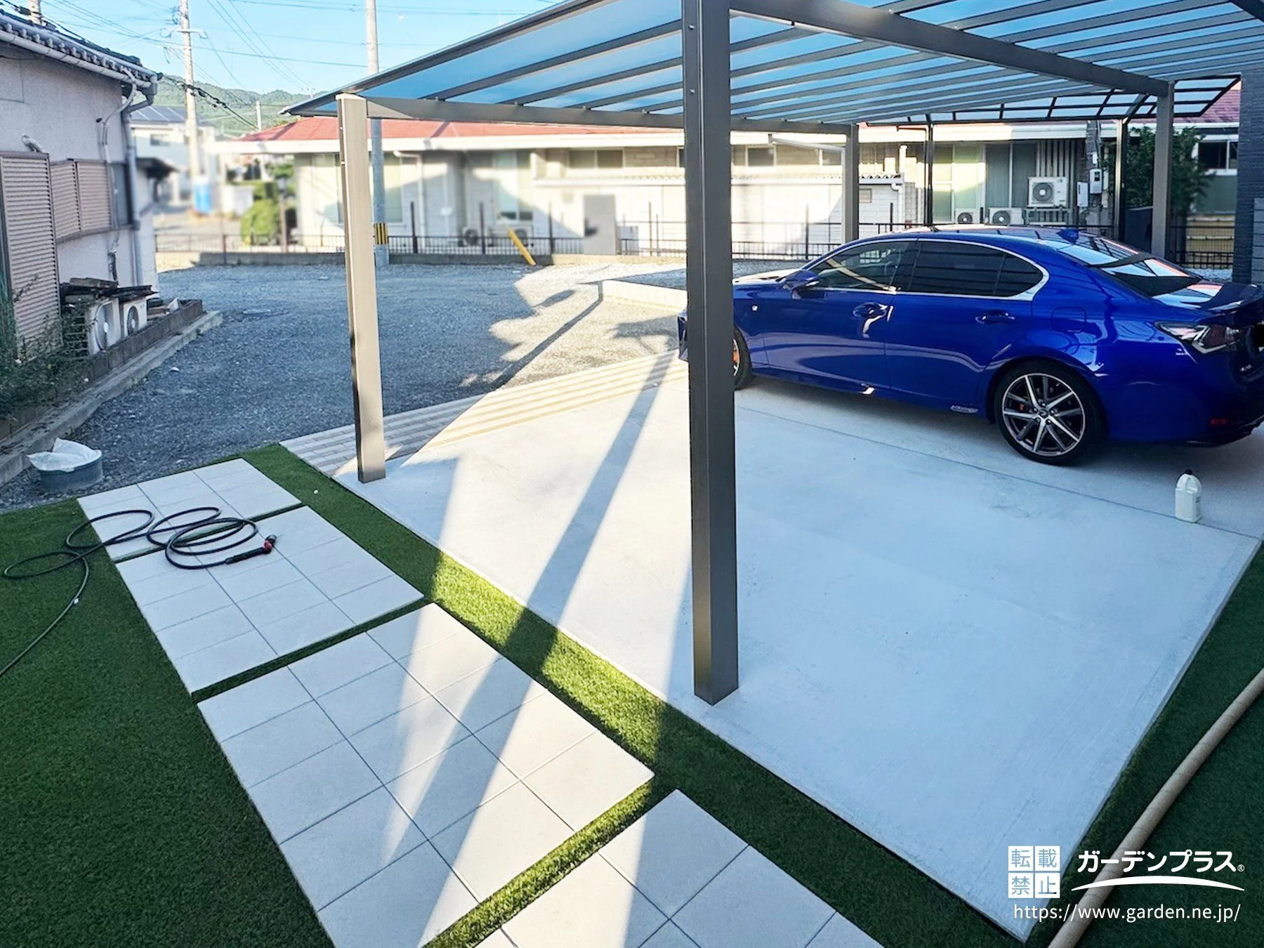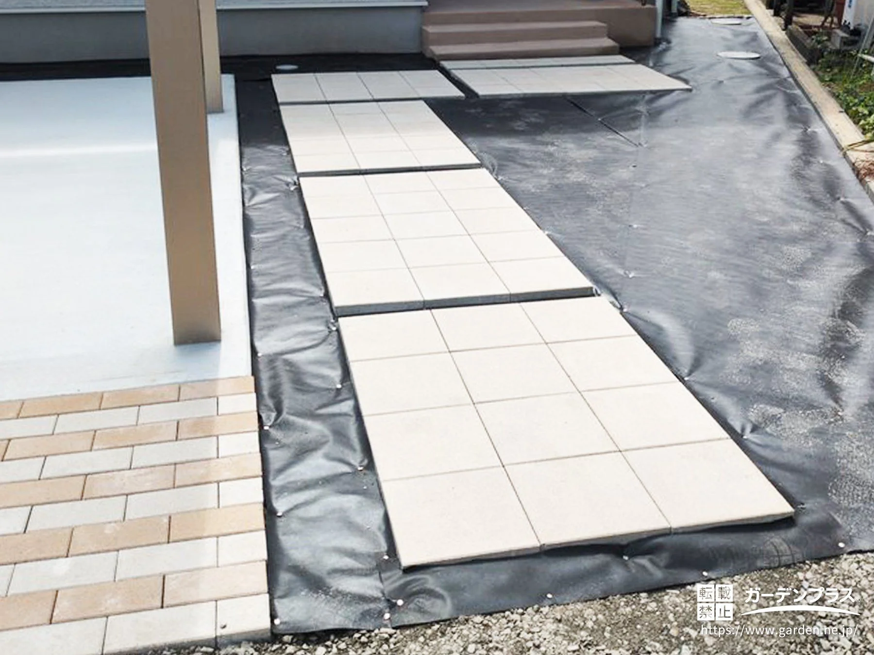 駐車スペースの仕上がりに合わせて、玄関までのアプローチもコンクリート平板でインターロッキング舗装しました。インターロッキングの足元は安定感があり、雨の日でも滑りづらく歩きやすい点が魅力です。平板の周囲には防草シートを施工し、雑草対策にも配慮。見た目の統一感と実用性を兼ね備え、日々の出入りが気持ちよくなるアプローチに仕上げました。