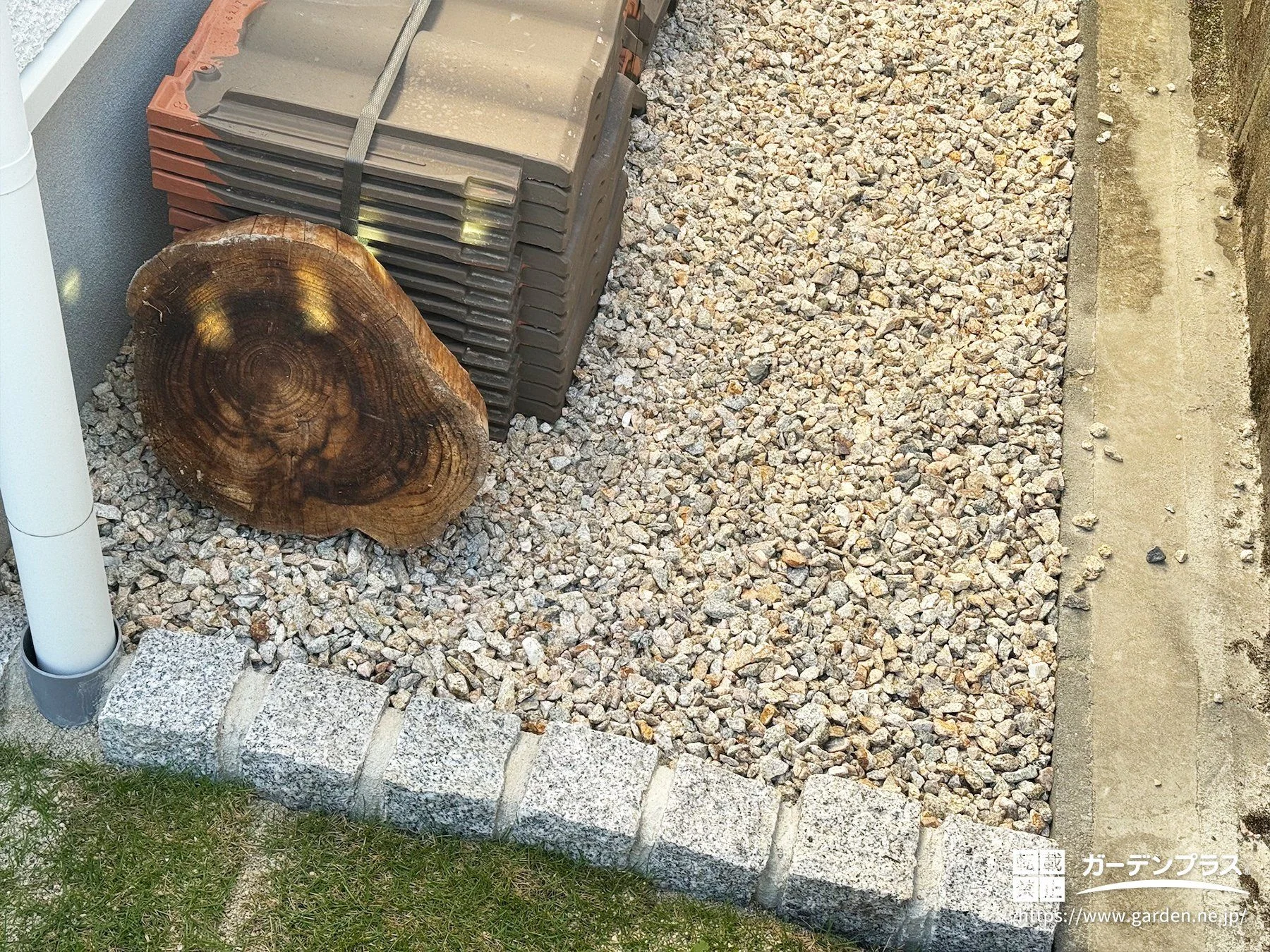 芝生と砂利の境界には、ピンコロ石を使って見切りを設けました。素材を切り替える部分をはっきりさせることで、足元が締まり、庭全体の印象も整います。さらに砂利の流出を防ぐ役割もあり、見た目だけでなく実用性にも配慮。日々のお手入れがしやすく、長く心地よく使えるための、さりげない工夫です。