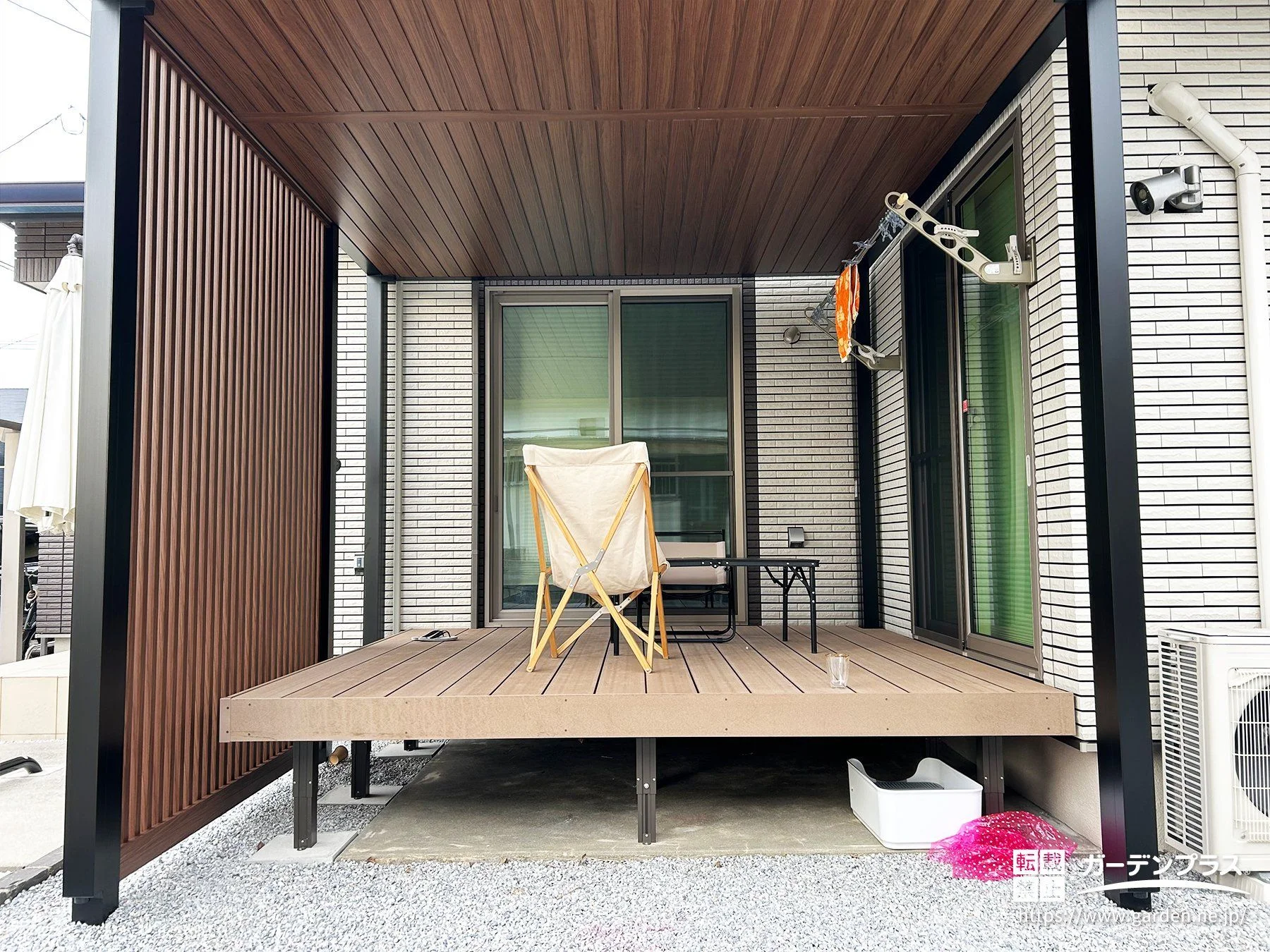 建物の入隅部分を活かし、室内から自然につながるデッキ空間をつくりました。2つの掃き出し窓をデッキでつなぐことで、洗濯や出入りの動線が短くなり、日常の動きがぐっとスムーズに。屋根と縦格子を組み合わせられるエクステリアで、外からの視線をやわらかく遮りながら、天気に左右されない設計となりました。入隅を活かした半屋外デッキ空間へ外構リフォーム工事です。
