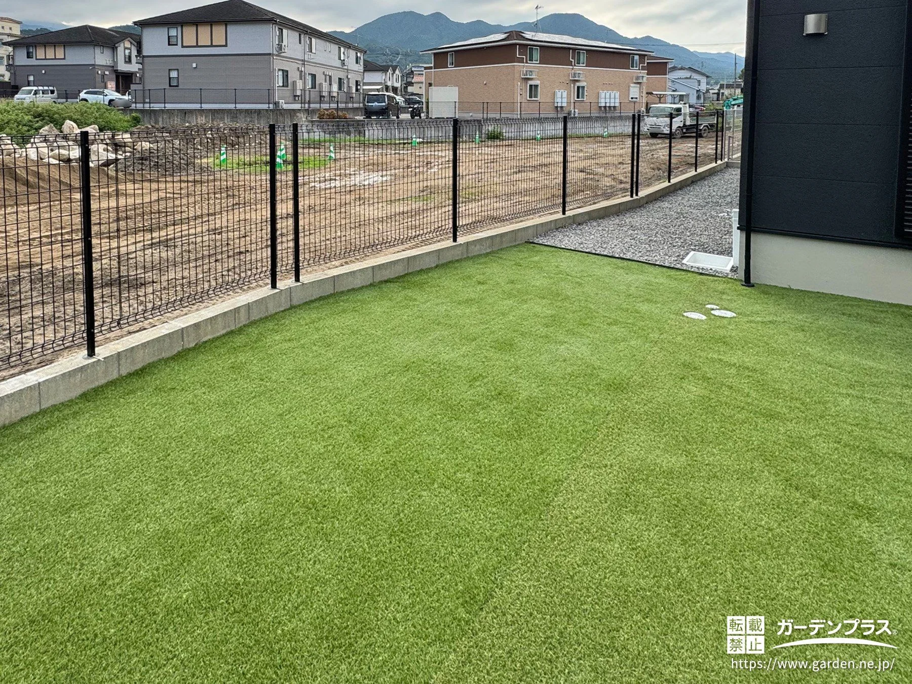 下地から整えた人工芝の庭は、雑草対策はもちろん、雨の日でも足元が汚れにくく、家族やお子さまが気軽に外へ出られるのが魅力です。境界には1200㎜のメッシュフェンスを設け、開放感を保ちながら転落防止に配慮した高さになっています。