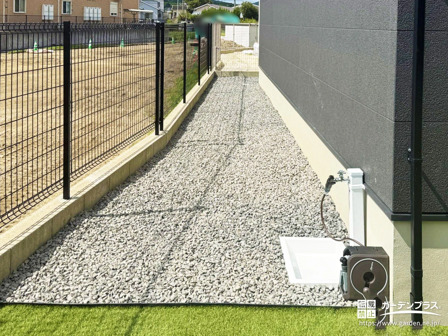 雑草の発生を抑え、雨の日でも水はねやぬかるみが出にくいよう、防草シートと砂利仕上げにすることで排水性を確保し、点検や掃除もしやすくなっています。人工芝との境目には見切りを入れ、素材同士が混ざらないよう配慮。見た目のすっきり感と、将来のメンテナンス性を両立しました。