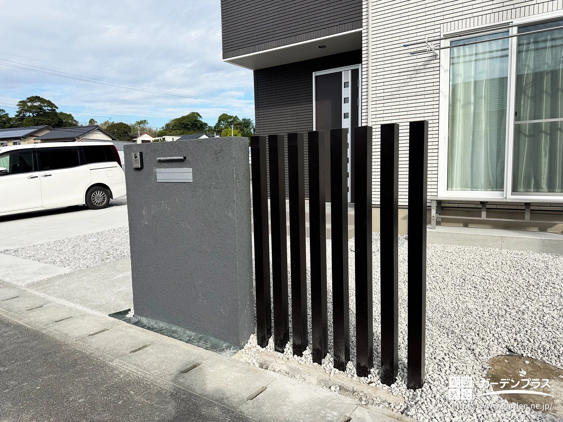 外壁と調和するモノトーンのスタイリッシュな新築外構