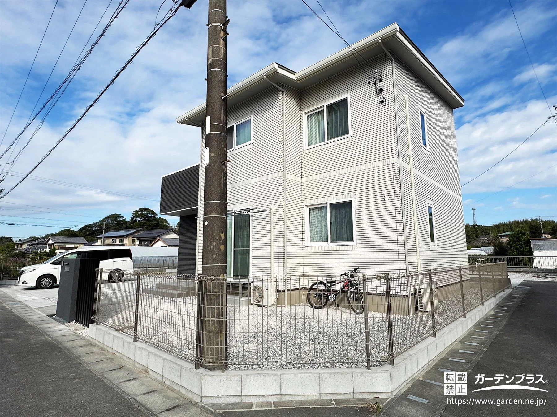 建物の外壁デザインに合わせ、全体をモノトーンでまとめた新築外構です。駐車スペースとアプローチはコンクリート仕上げとし、日常使いのしやすさとすっきりした印象を両立。門柱は塗り壁と縦ラインのアクセントを組み合わせ、視線をやわらかく遮りながら外観のポイントにしています。主庭や犬走りは防草対策を施し、将来の手入れ負担を軽減。境界フェンスは開放感を残しつつ敷地を明確にし、安心感にも配慮しました。暮らし始めてからの使いやすさを大切にした、統一感のある外構計画です。