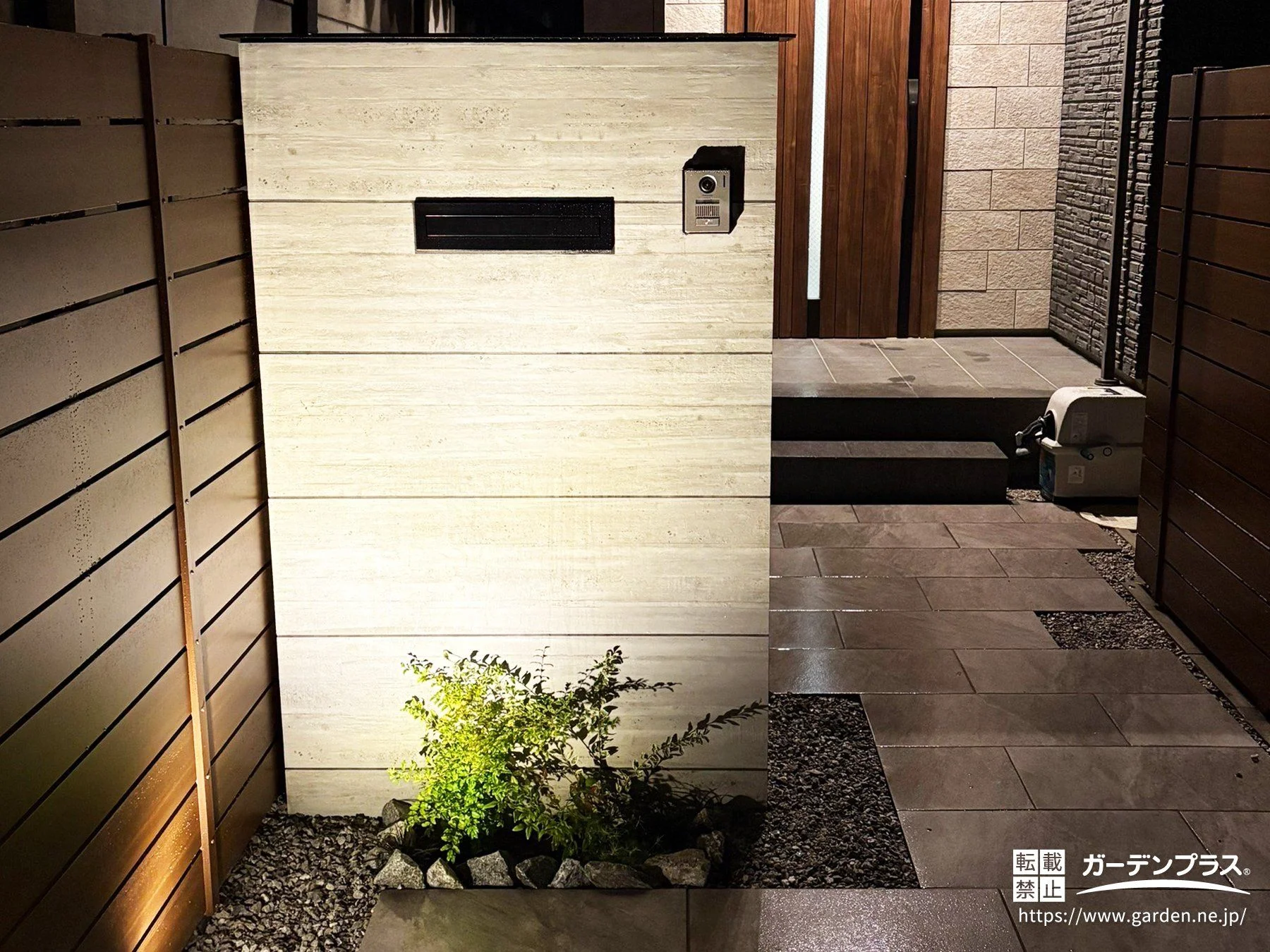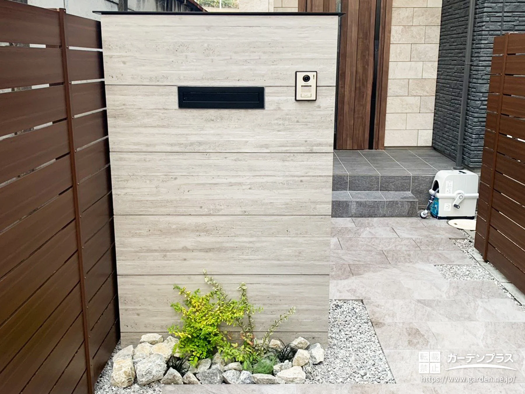 門柱:ブロックベース + コンクリートブロック + タイル張り タカショー セラウォール RC杉板