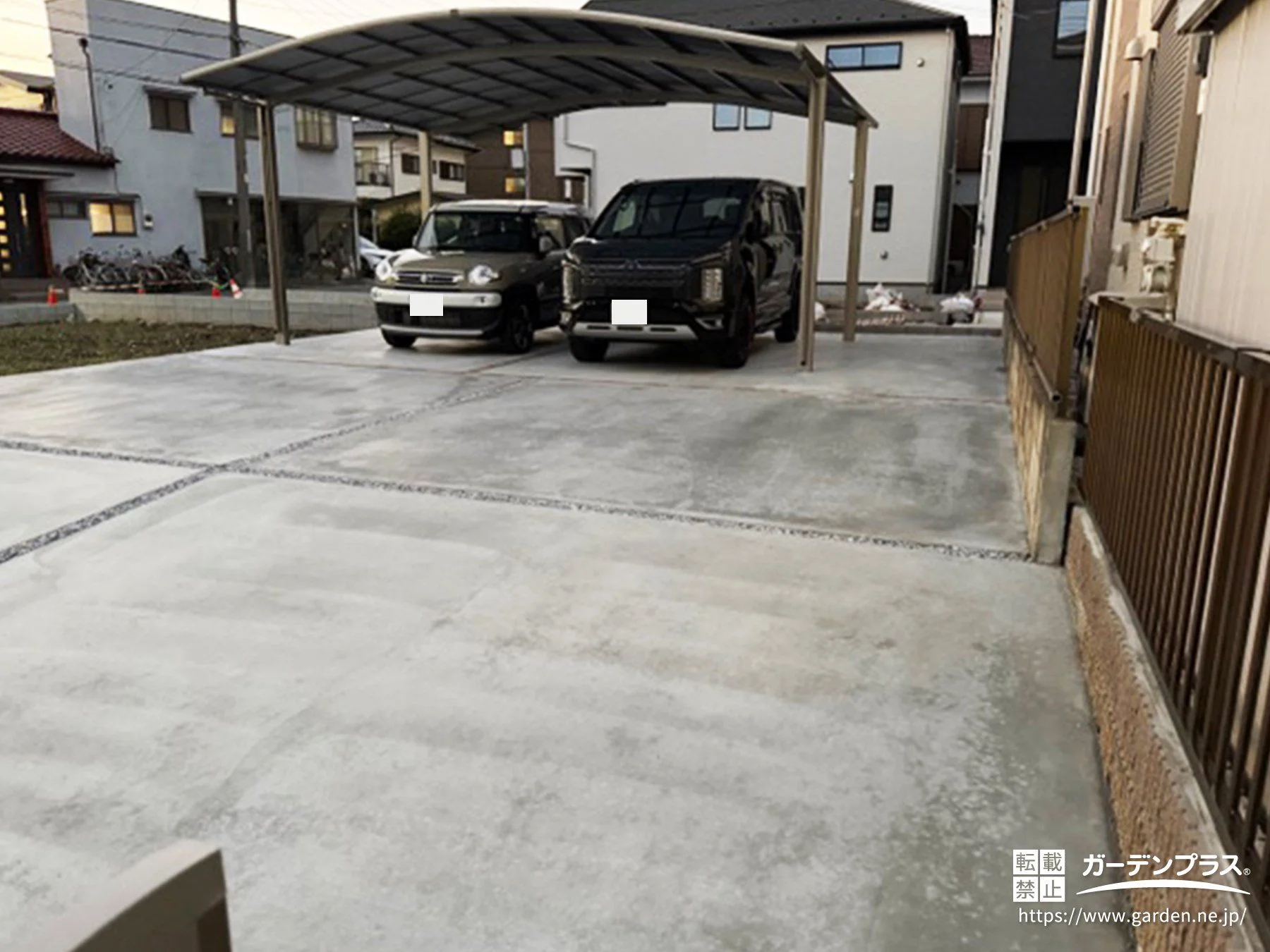 32坪の更地を「駐車しやすく、管理が楽な外構にしたい」というご要望を踏まえ、敷地全面を土間コンクリートで整えました。雑草が生えにくく、毎日の車の出入りもスムーズです。スリットに砂利を入れることで、ひび割れ防止と排水性を確保。雨や日差しを避け、愛車の劣化を守るカーポートは、お客様のご希望から設置し、天気の悪い日の乗り降りもスムーズです。また、道路側には伸縮門扉を設け、敷地をほどよく守りつつ開閉も簡単に。雑草だらけの更地は、長く安心して使える実用的な駐車スペースに生まれ変わりました。