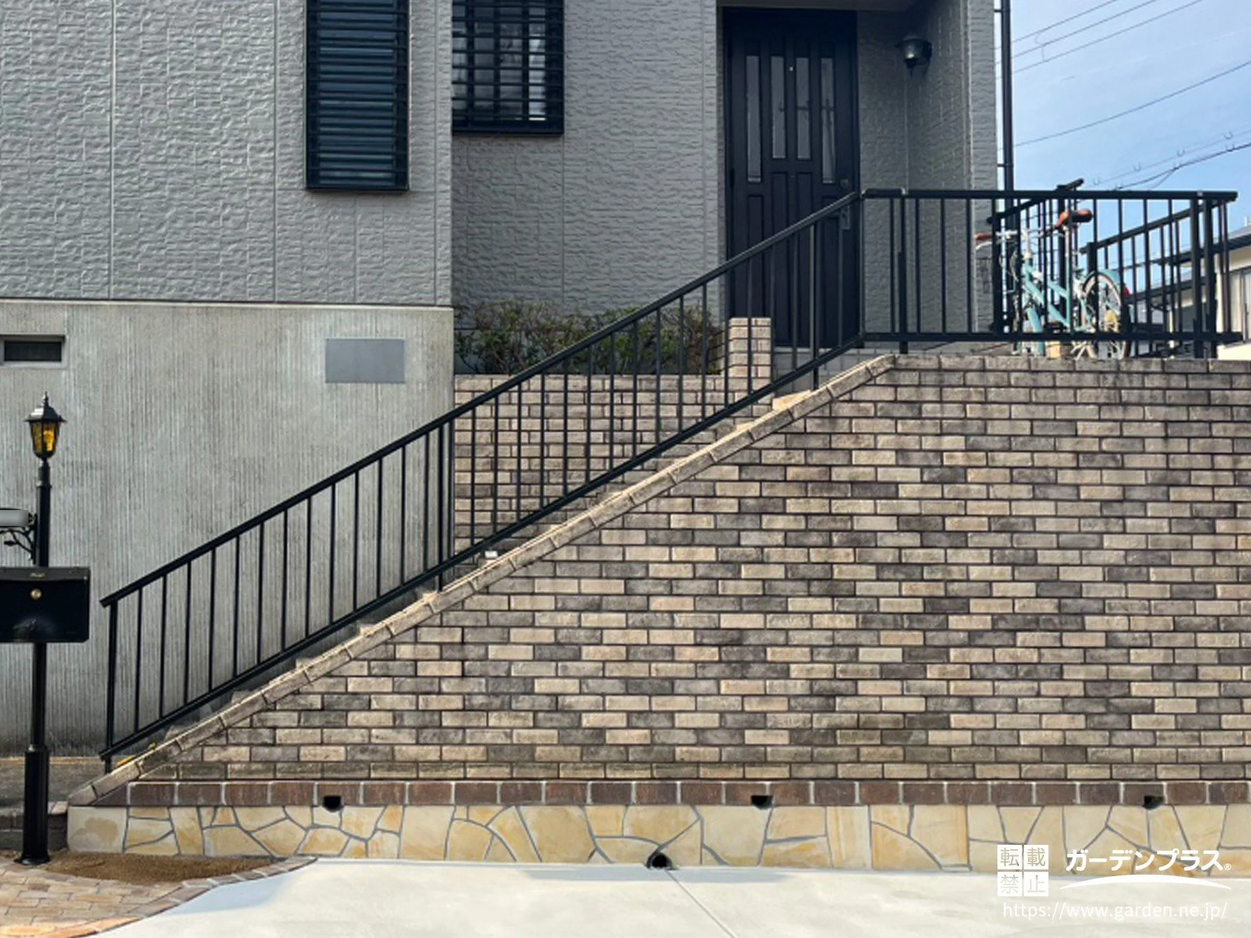 花壇を撤去することで見えてしまった階段袖壁の下部分の基礎に乱形石を張り美しく仕上げました。石の自然な風合いがお住まいにマッチしています。