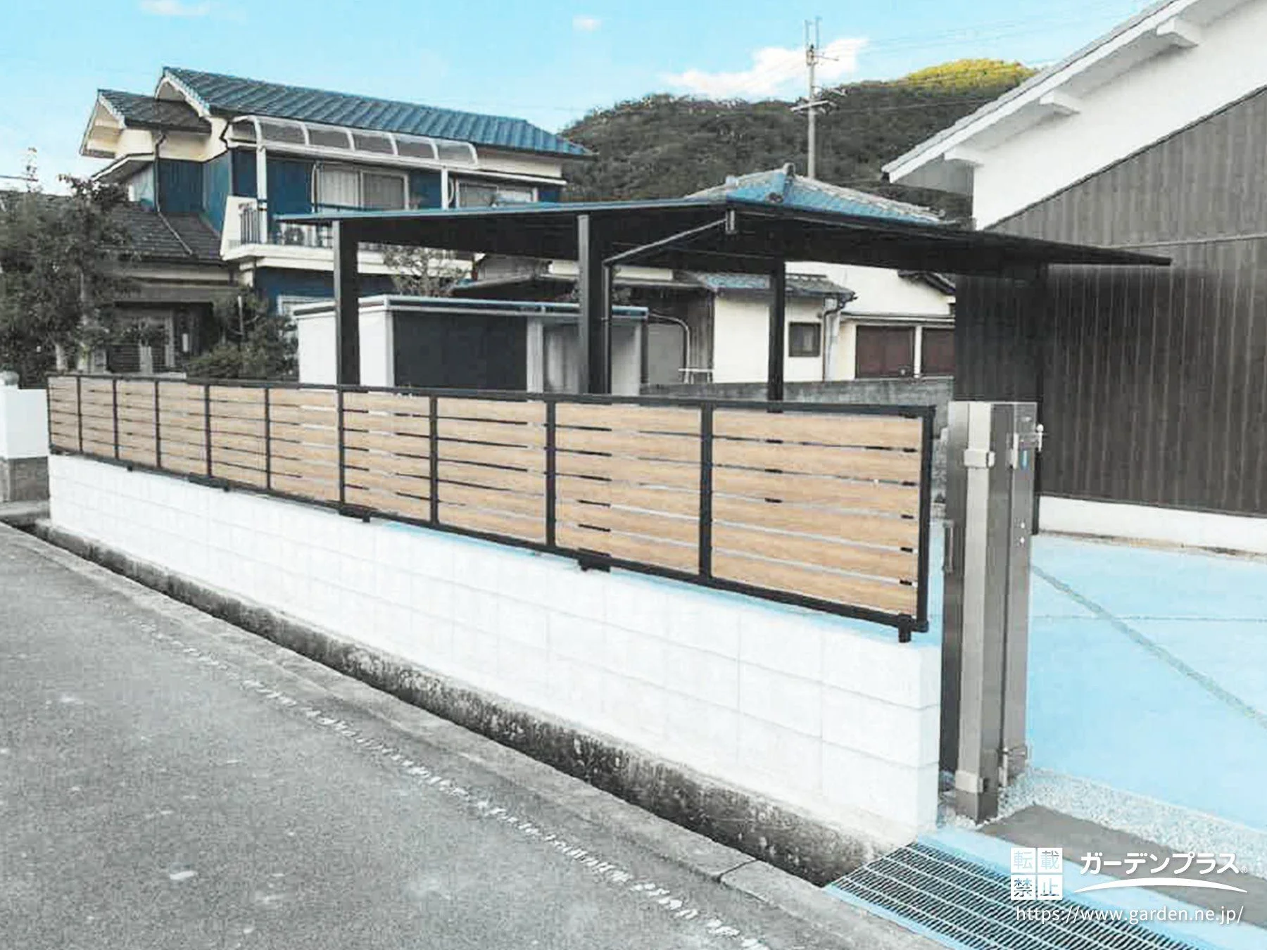 道路からの視線をやさしく遮る、木調フェンスのある外構