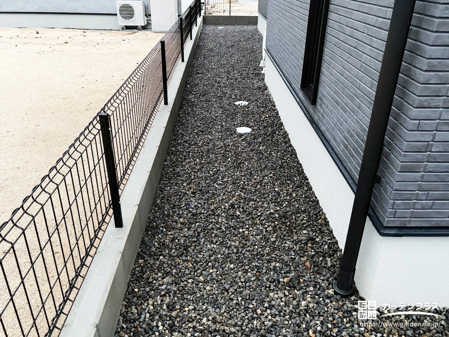 建物まわりは雑草対策と排水性を意識し、防草シート+砂利でシンプルに整えました。メンテナンスの手間を減らしながら、外壁に土が跳ねにくい状態をキープ。境界にはメッシュフェンスを採用し、圧迫感を抑えつつ敷地をしっかりと区切る、防犯性にも配慮した建物周りが完成しました。