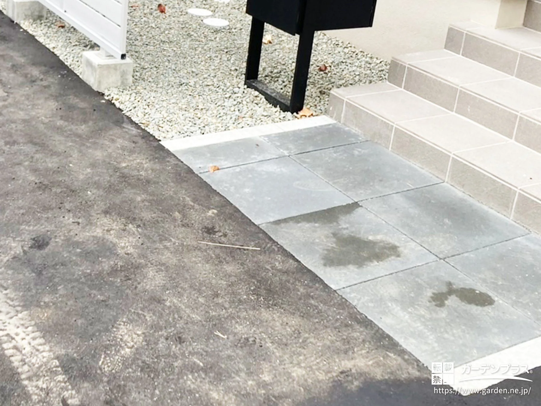 玄関前を歩きやすくするため、安定感のある大判の平板でアプローチを構成しました。タイル階段との色味を揃えることで住まいに自然と馴染み、シンプルながら上品な印象に。舗装面がしっかり確保されるため、雨の日でも靴底が安定し、毎日の出入りが快適です。