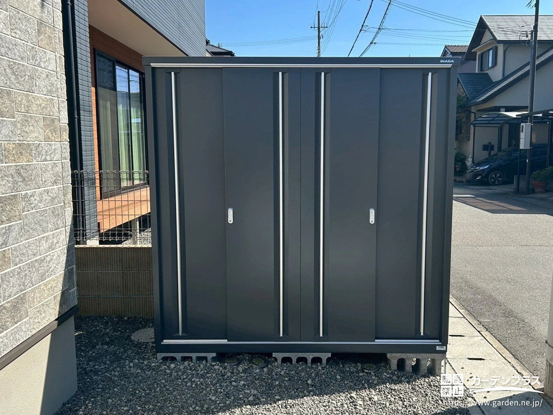 駐車スペースの一画に物置を設置しました。シックなグレーのカラーがお住まいによくマッチしています。お車のメンテナンス用品等の収納に便利にお使いいただけます。