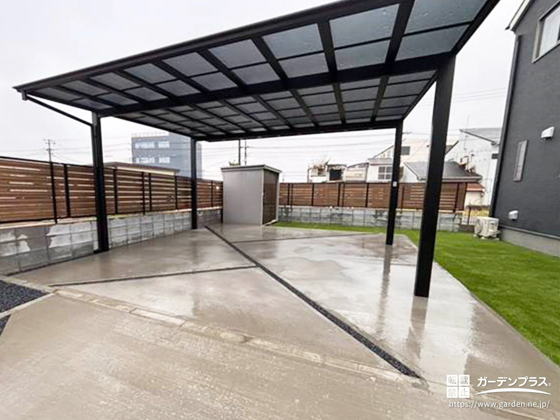 洗車を楽しむお施主様のこだわりを軸に、駐車スペースと主庭をひと続きで計画。土間コンクリートとカーポートにより、愛車を守りながら洗車作業がしやすい環境を整えました。床面は水を流しやすく、日々の手入れも快適。隣接する人工芝の庭では、お子様を見守りながら洗車を楽しんだり、夏には屋根の下でプール遊びもできる、暮らしにゆとりを生む外構リフォーム工事です。