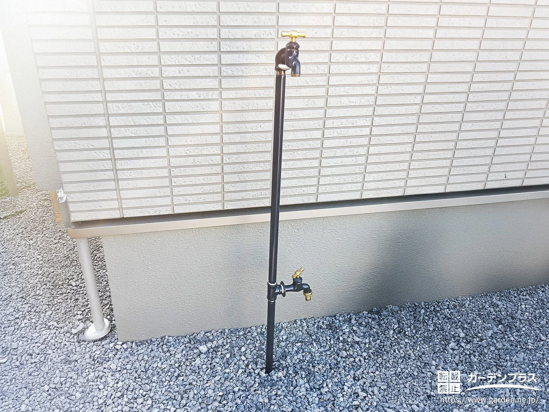 建物北側にシンプルでスリムなデザインの立水栓を設置しました。2口水栓がついているため、ホースの常時接続が可能です。