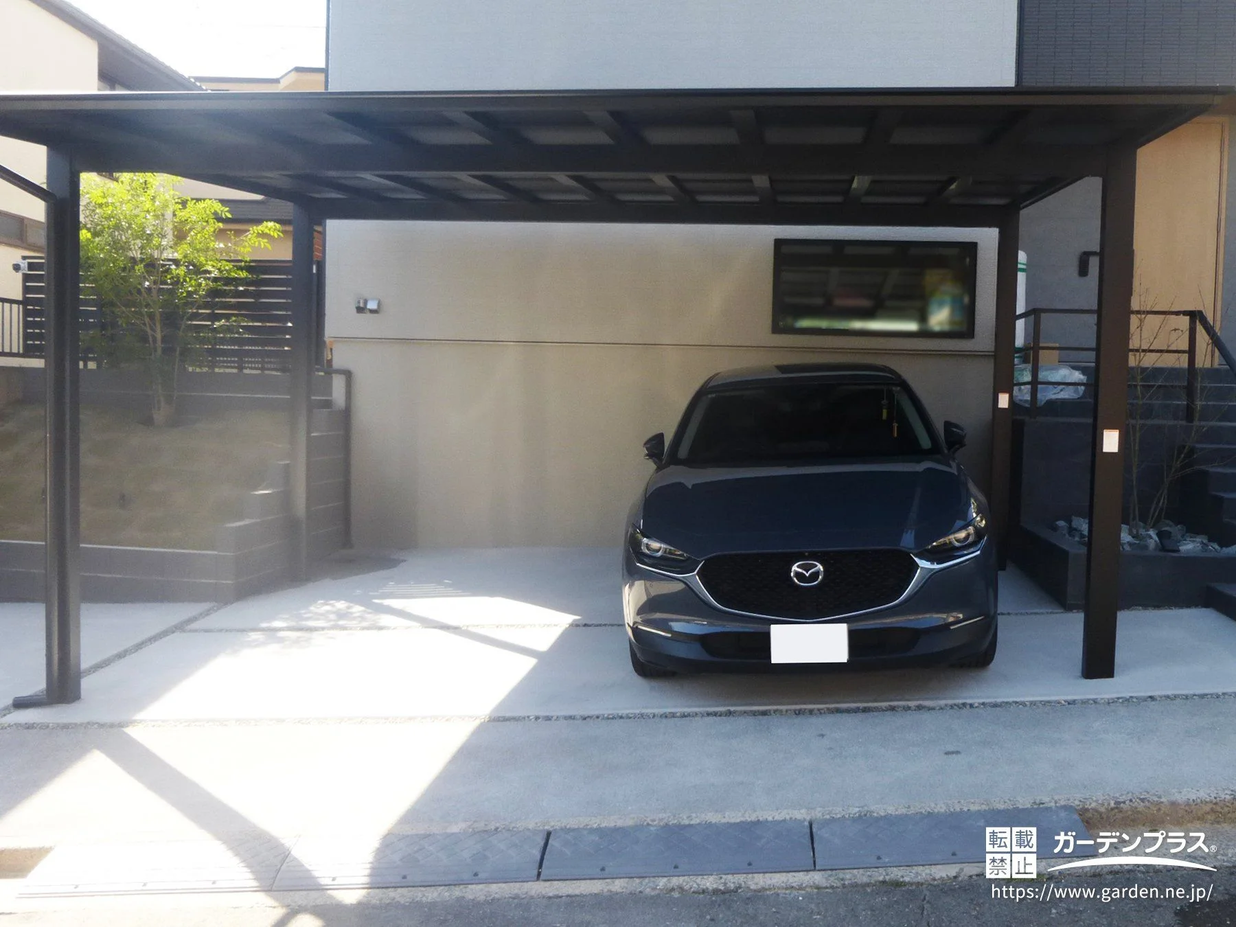 直線の美しさが邸宅と調和する、ブラックのフラットカーポート