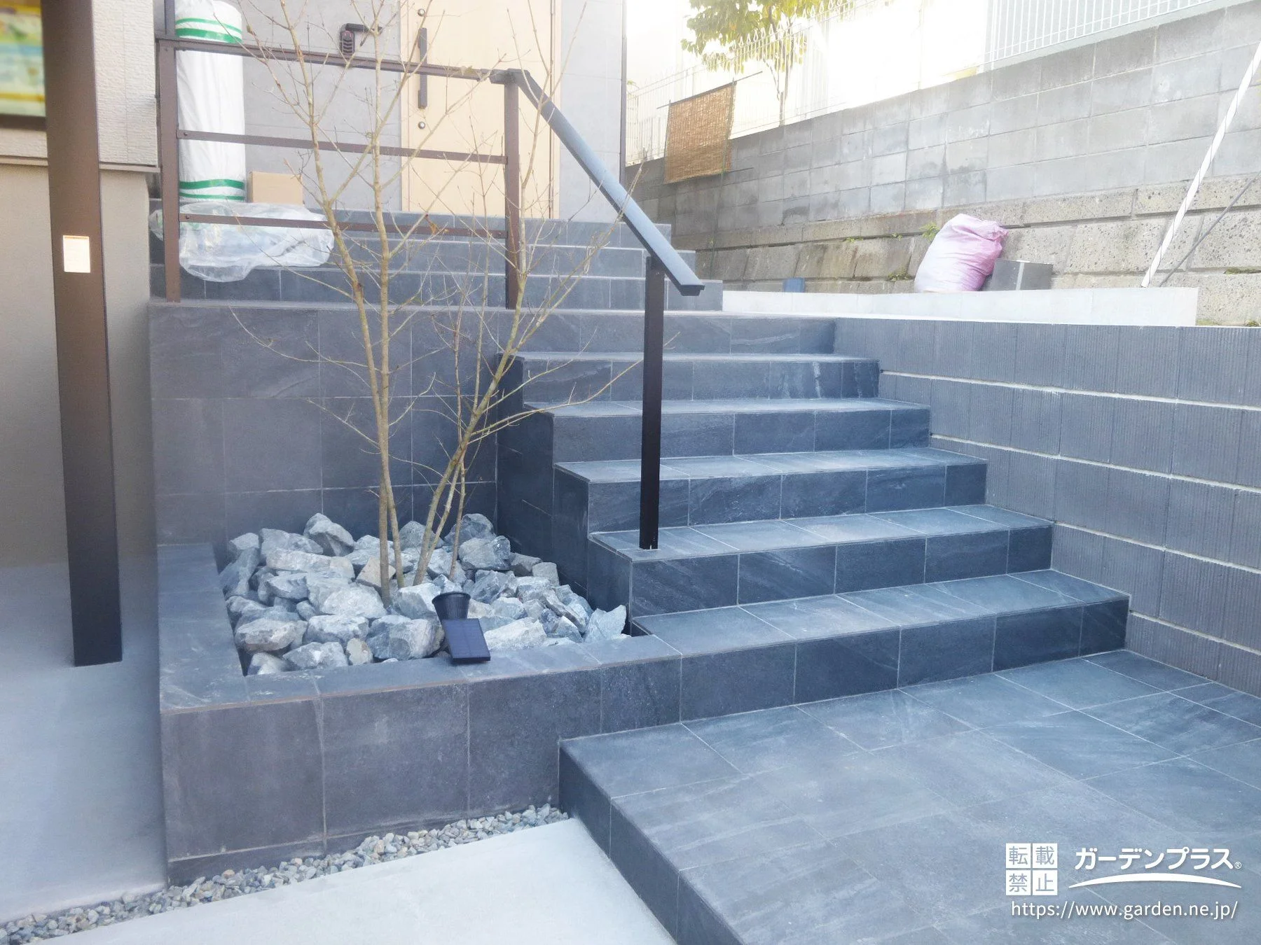 アプローチステップ:下地コンクリートブロック + タイル張り