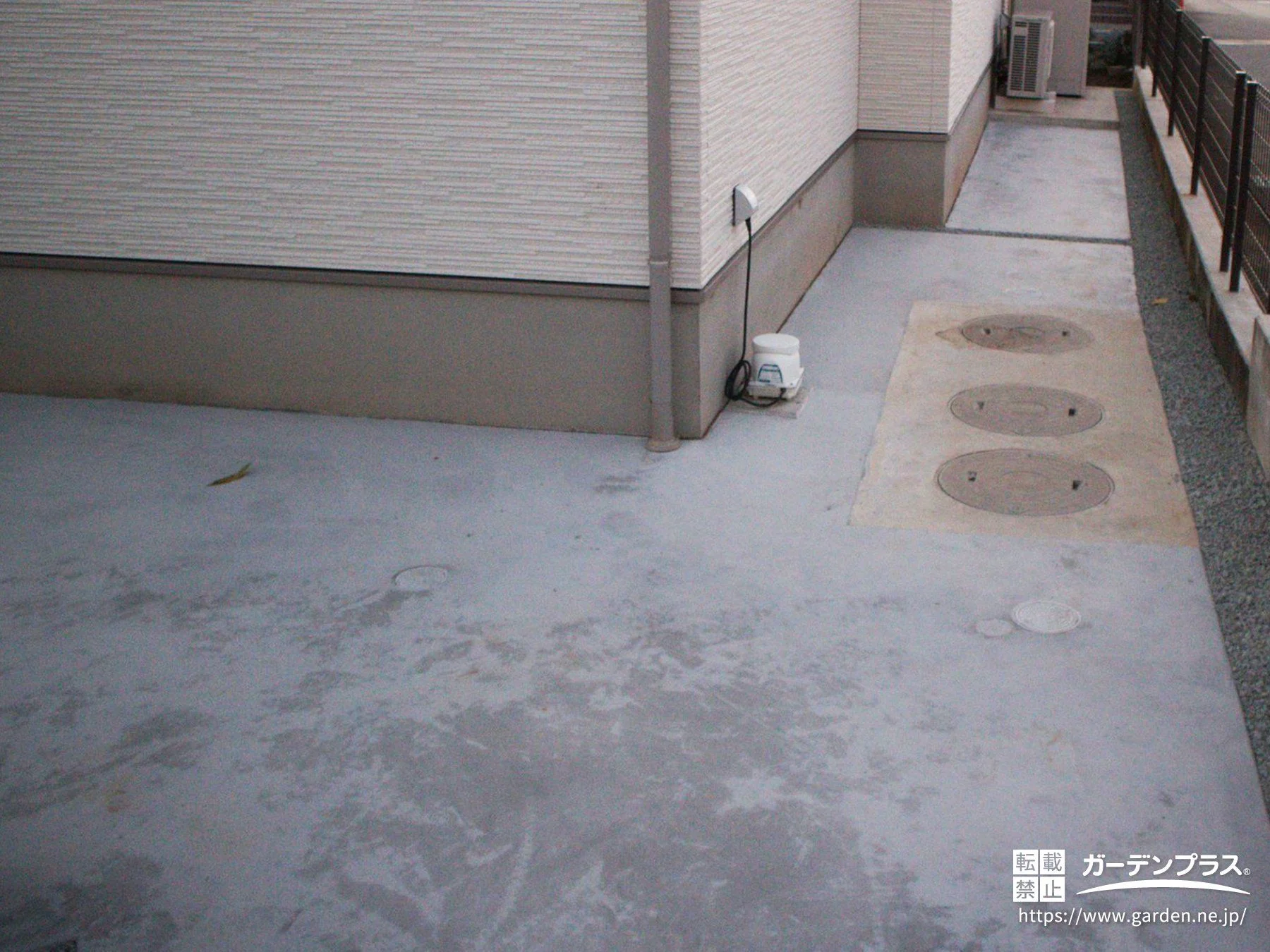 犬走り:土間コンクリート 金鏝仕上げ + スリット 砂利