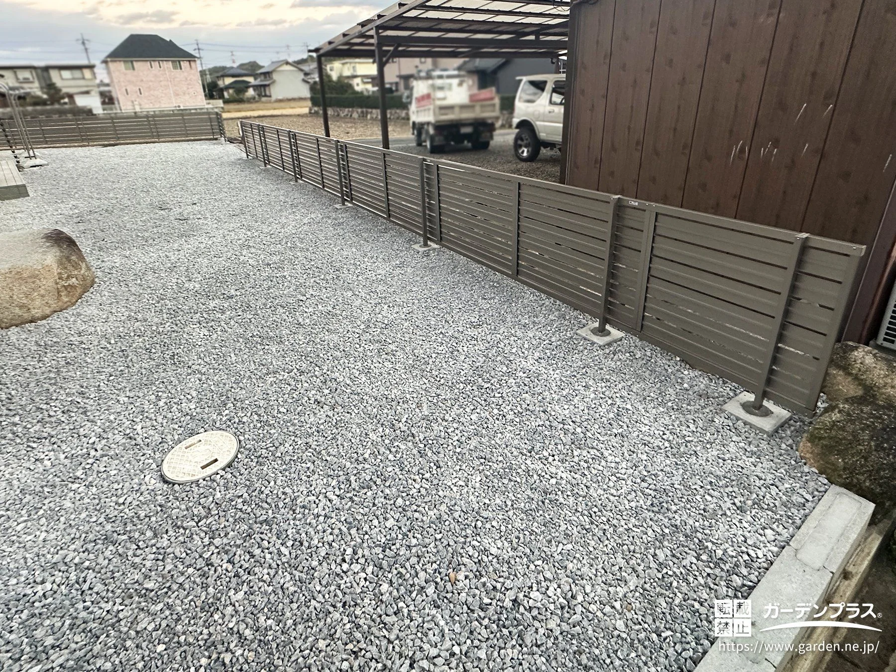 「目隠し」と「除草対策」という、外構で多くの方が悩まれるポイントを、無理なく解決したプランです。変形地に沿って設けられていた庭木を整理し、境界には明るいトーンのフェンスを新設。視線をやさしく遮りながら、敷地内がすっきりとし、これまで以上に広さを感じられる空間になりました。また、建物まわりには防草シートを丁寧に敷設し、雑草が生えにくい環境を整えています。休日に草むしりに追われることがなくなり、時間にも気持ちにもゆとりが生まれるのは大きな魅力です。砂利を敷いたことで、歩いた際の音がさりげない防犯対策にもなり、安心感もプラスされました。手間をかけずにきれいな状態を保てるローメンテナンスな外構に整ったことで、施主様が毎日をより軽やかに、心地よく過ごせる住まいが完成しました。