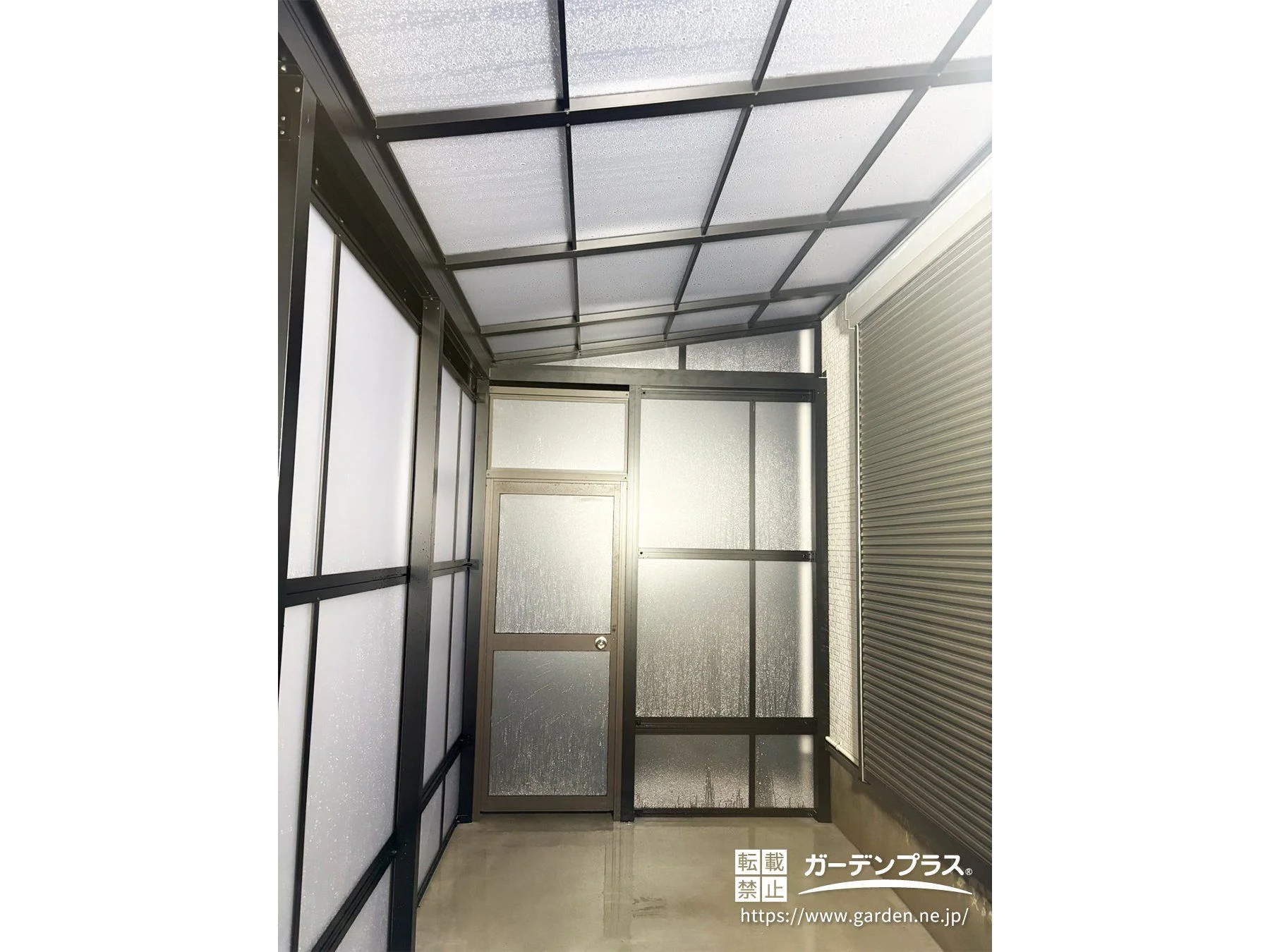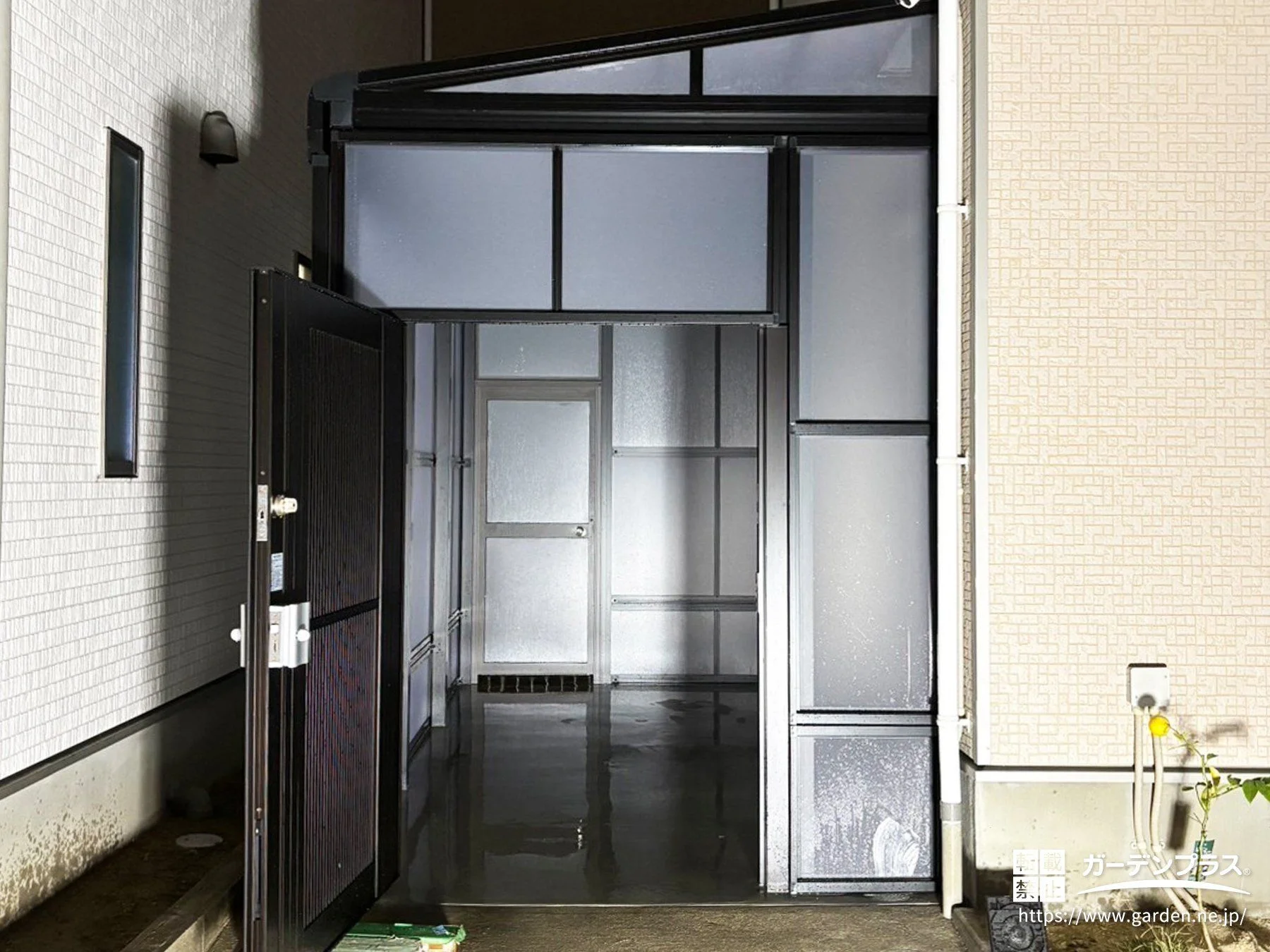 お庭の掃き出し窓前にストックヤードがほしいとお客様からご依頼いただきました。「LIXIL スピーネ」をベースに、前面スクリーン・側面パネル・出入口ドアを組み合わせたストックヤードを設置しました。敷地形状に合わせてパネルの高さを細かく調整し、雨風や外からの視線をしっかりカット。掃き出し窓からの出入りもスムーズになり、物干しや一時置き場としても活躍する、使い勝手と安心感を兼ね備えた実用的な空間に仕上がっています。