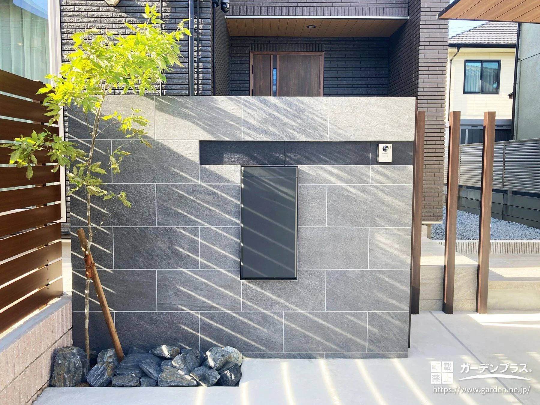 建物がもともと持つモダンで洗練された佇まいに寄り添いながら、素材の質感を大切にした外構計画としました。木目のやわらかな表情と、タイルの落ち着いた重厚感がほどよく調和し、時間の経過とともに少しずつ味わいを深めていく外構に。アプローチには浮き階段をセレクトし、ラグジュアリーな雰囲気を演出しています。また、足元にはお手入れのしやすい土間コンクリートや人工芝、砂利敷きにすることで、日々の暮らしの中で、無理なく美しさを保てるよう、細かなところまで配慮しています。使いやすさとデザイン性が自然に溶け合い、住まう方の暮らしにそっと寄り添う、心地よい住まいの景色が完成しました。