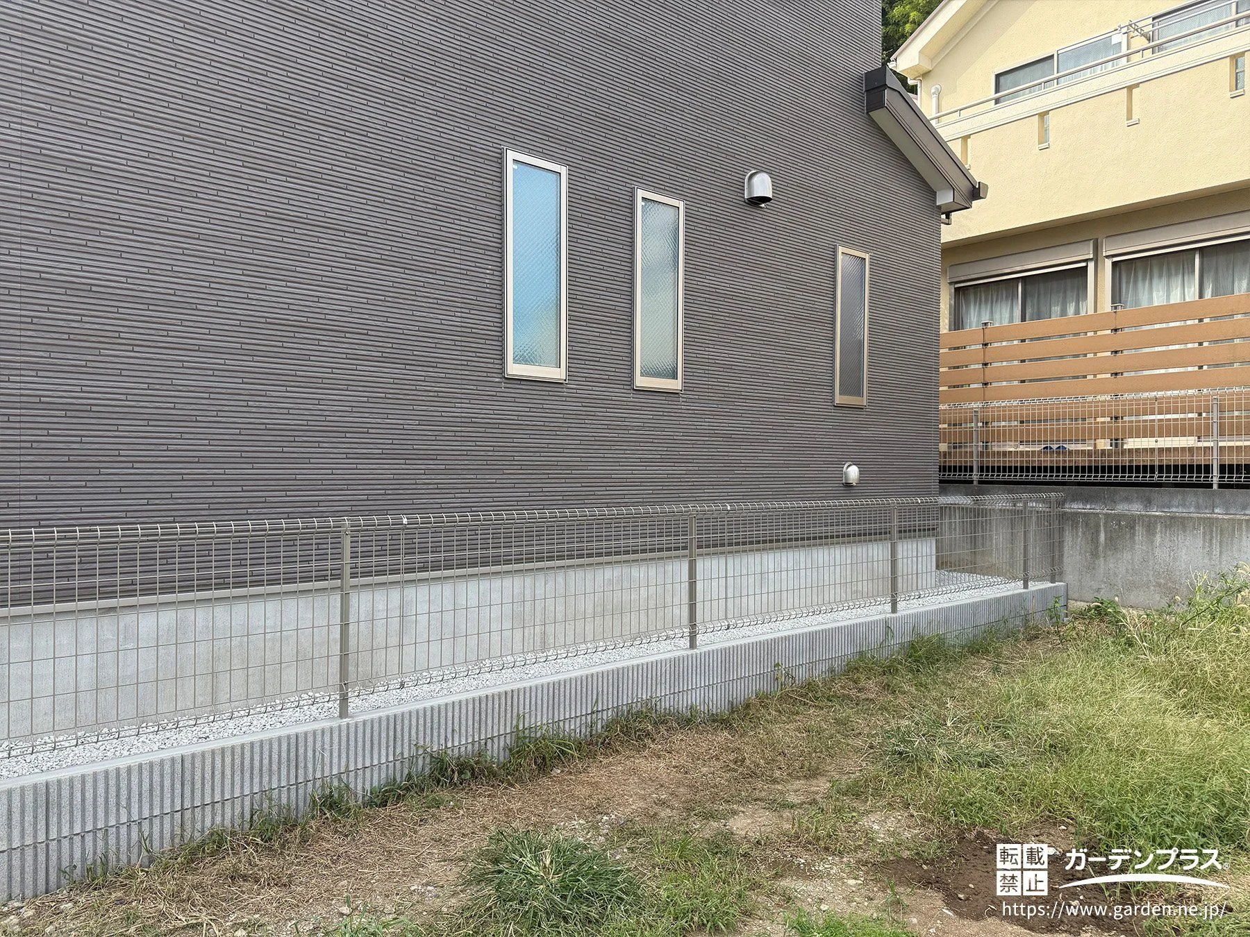 犬走に防草シートと石灰砂利を敷き、雑草対策をしました。境界にはメッシュフェンスをとりつけ圧迫感なく敷地を明確化しています。