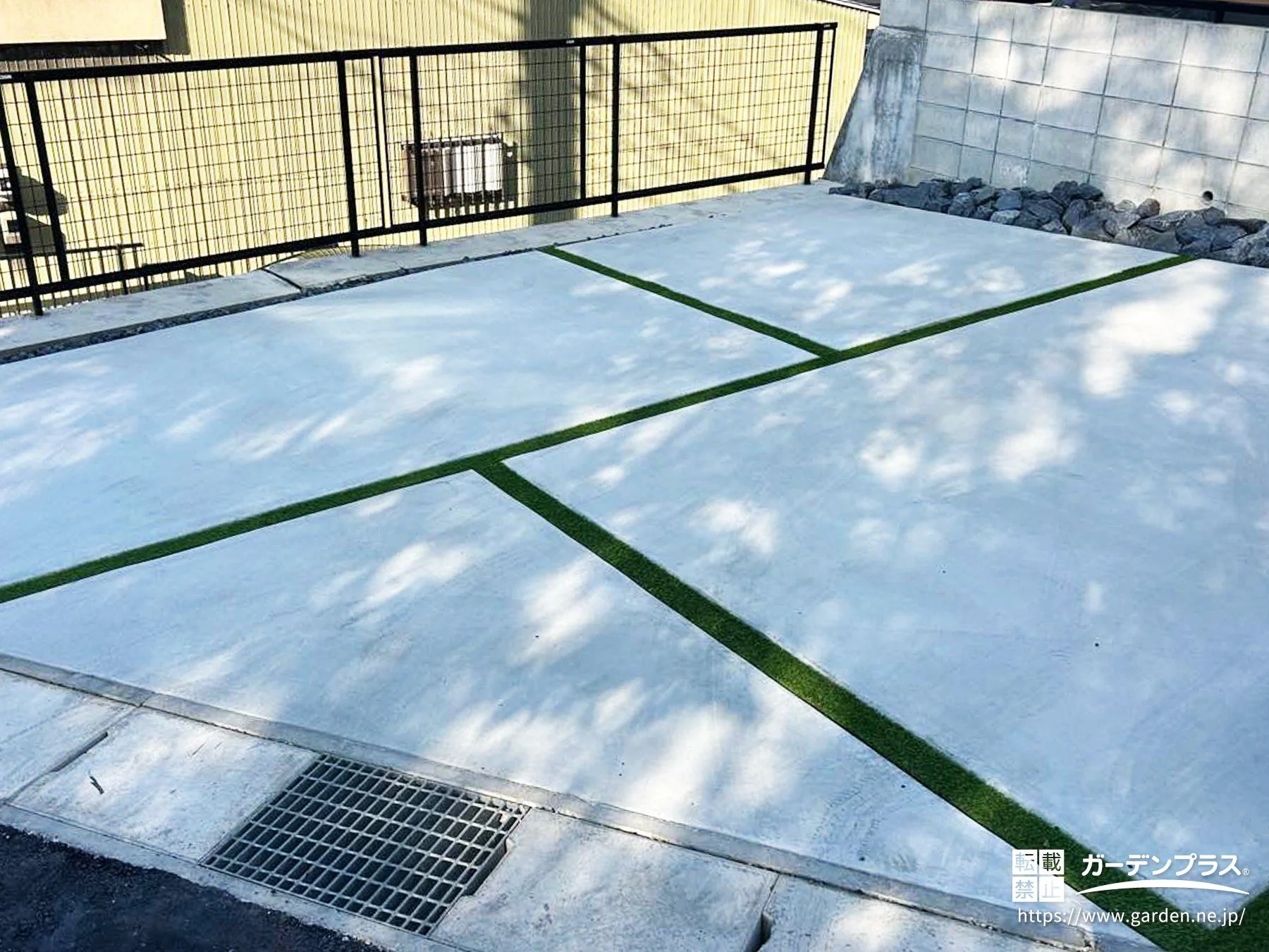 駐車スペース:土間コンクリート + スリット 人工芝