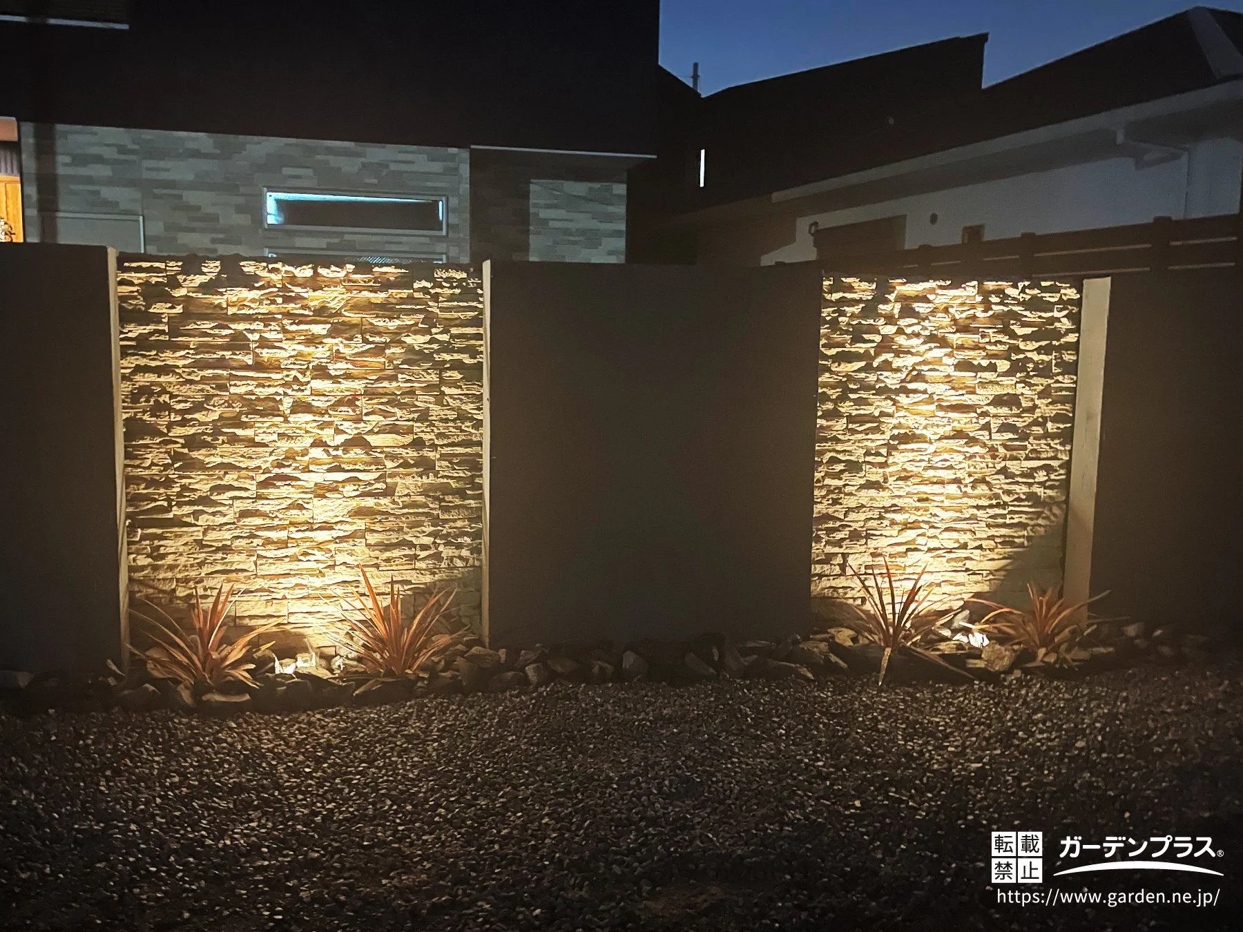 目隠し塀には型枠ブロックを用い、しっかりとした構造で安心感のある外構としました。下地に型枠ブロックを使用することで耐久性が高く、長く安心して使えるのも大きなポイントです。表面は塗装仕上げと石調タイルを組み合わせ、重厚さの中にデザイン性をプラス。夜はグランドライトが壁面の凹凸を美しく照らし、昼とは違う落ち着いた表情に。見た目の美しさだけでなく、頑丈さと暮らしやすさにも配慮した外構リフォームです。