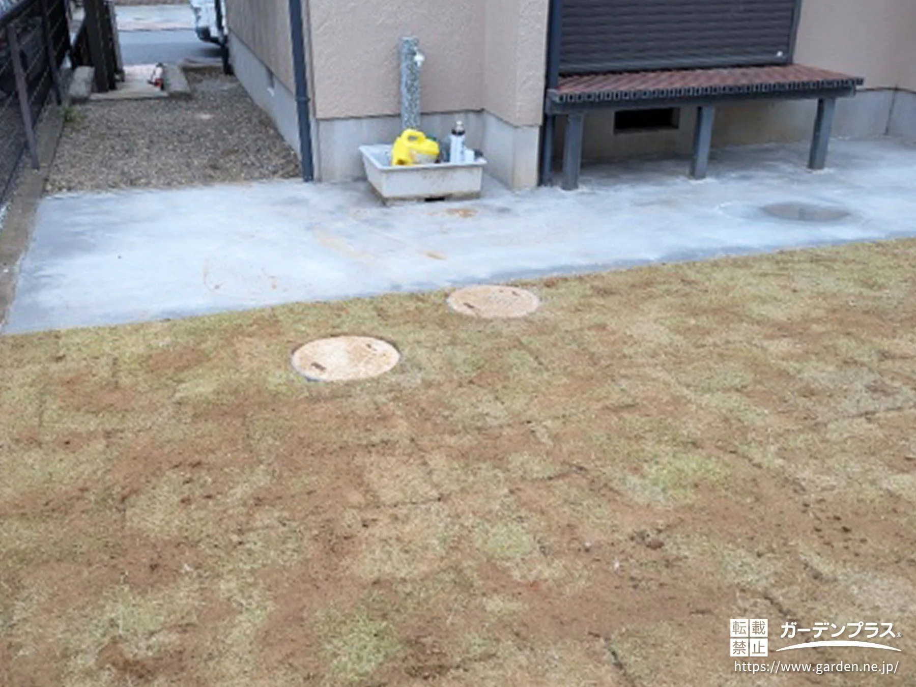お庭の敷地境界にあった植栽を整理し、横板デザインの目隠しフェンスを設置することで、外からの視線をやわらかく遮りながらすっきりとした印象に整えました。フェンスの落ち着いた色合いがお住まいの外観になじみ、道路から見たときも統一感のある外まわりに仕上がっています。併せて掃き出し窓の前には土間コンクリートを打設し、足元の安定感を確保。雨の日でもぬかるみにくく、室内外の行き来がしやすい実用的な空間となりました。視線対策と使い勝手の両立を意識した、暮らしに寄り添う外構の完成です。