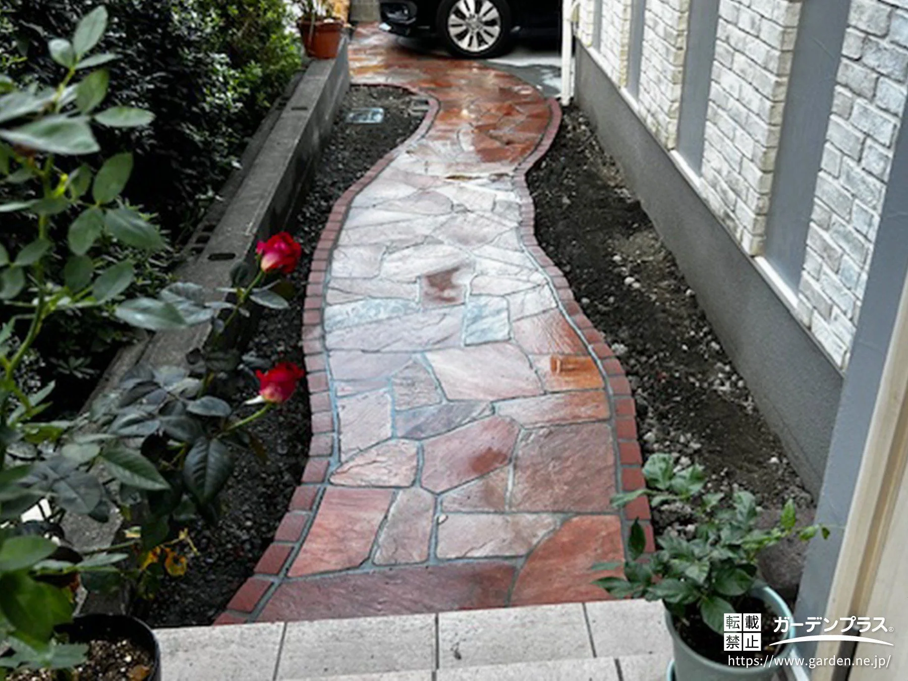 玄関アプローチを自然石張りで仕上げました。温かみのあるカラーでナチュラルな仕上がりとなっています。足元が平らで歩きやすく、日々の動線も快適です。縁取りにはレンガを用い、アクセントを加えました。