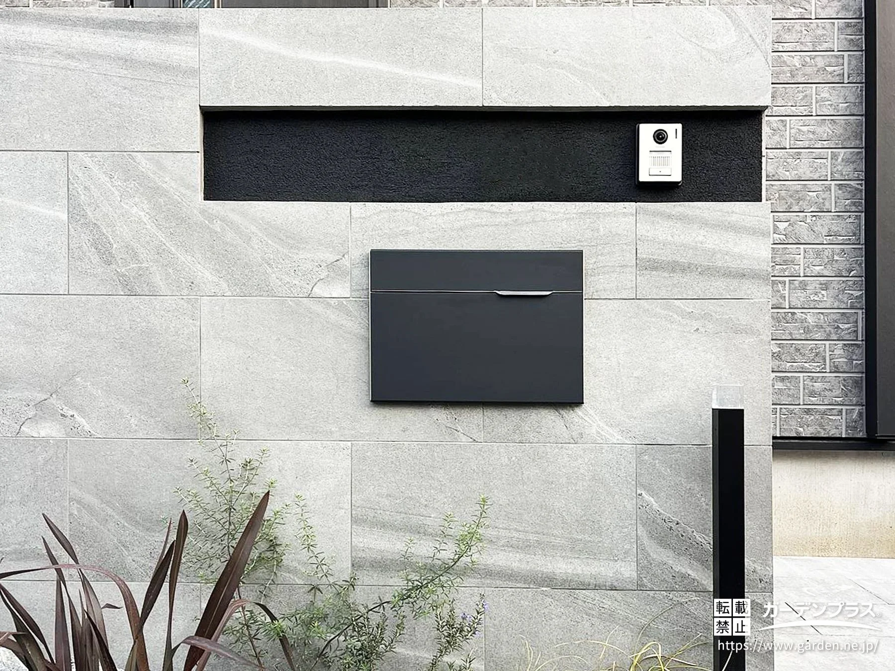 石調タイル門柱が映える、グレー×ブラックのモダン新築外構