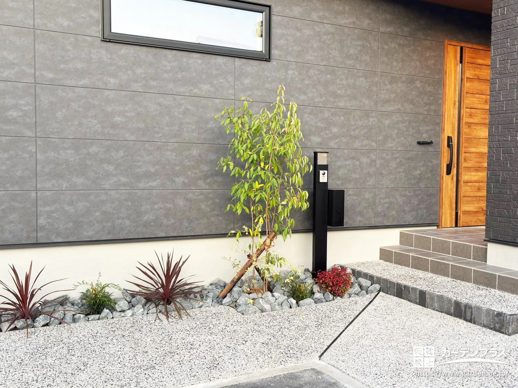 今回の外構は、平屋ならではの落ち着きと品格を大切に、素材のコントラストで魅せるデザインを目指しました。主役となるのは、質感豊かな「洗い出し」のアプローチと、自然の力強さを感じるロックガーデンです。これらを黒の機能門柱やレンガのラインで引き締めることで、和の情緒と現代的なモダンさが溶け合う、飽きのこない空間が完成しました。階段の増設や徹底した防草対策など、住まう人の日々の動線と管理のしやすさも細部まで計算されています。「美しく整うこと」と「暮らしやすいこと」が重なり合い、平屋の佇まいをより一層贅沢に仕立てる、機能美あふれる住まいが整いました。