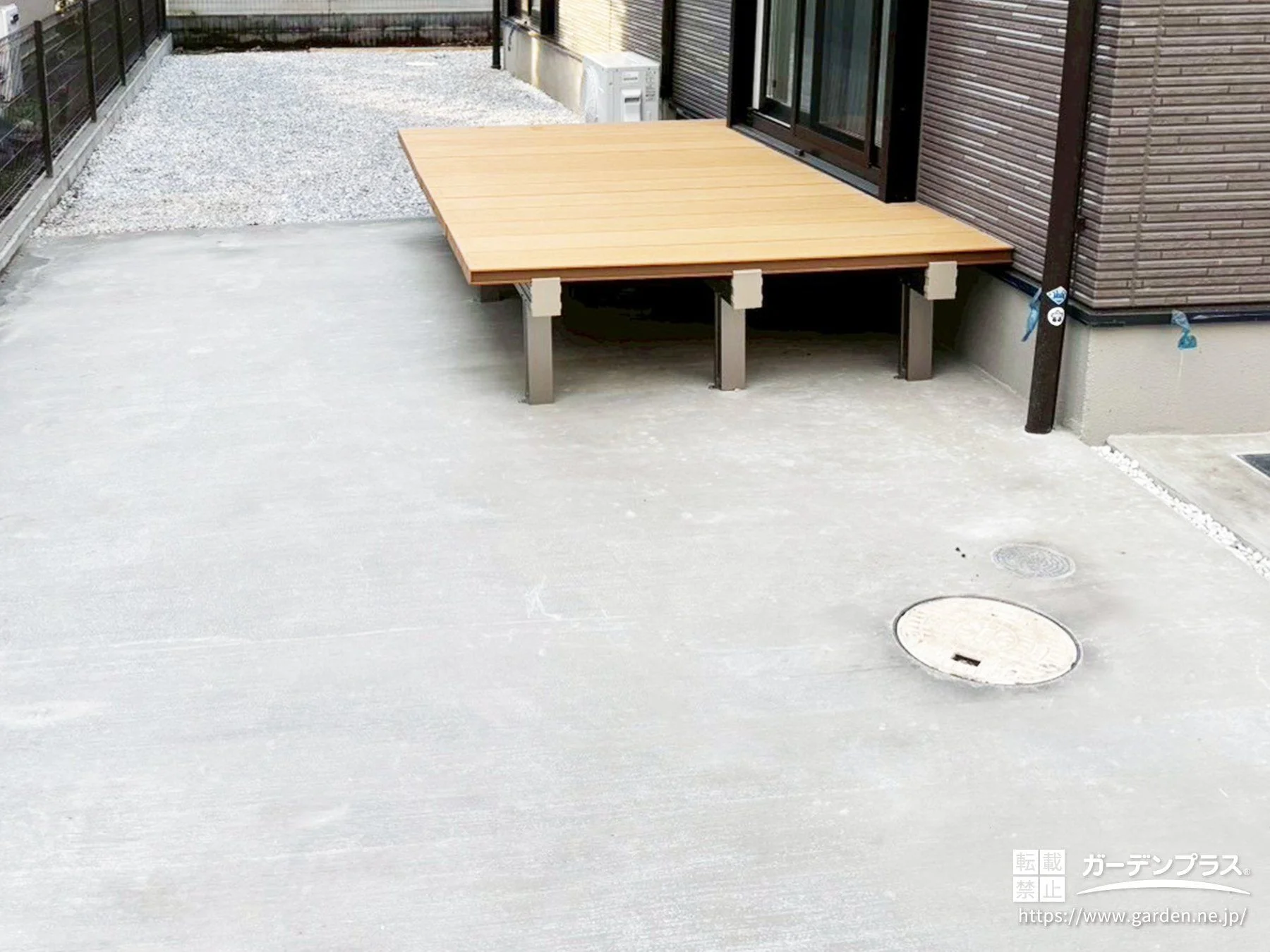 駐車スペースと主庭を土間コンクリートで整え、動線をシンプルにまとめた新築外構です。ウッドデッキとつながるテラスが日常の使い勝手を高め、建物まわりは砂利で管理しやすく。無駄を省いた構成の中に、暮らしやすさを丁寧に落とし込んだ外構に仕上がっています。