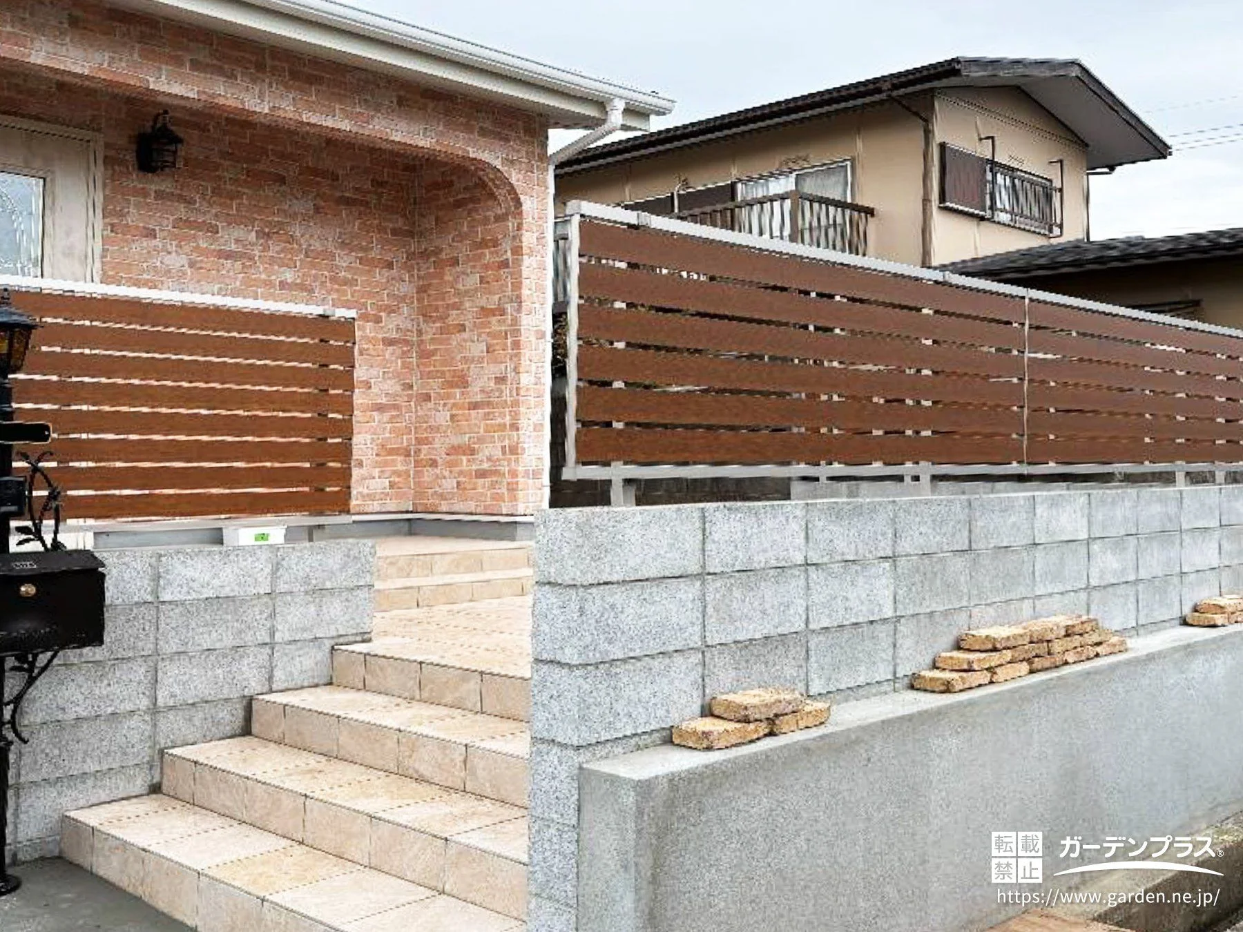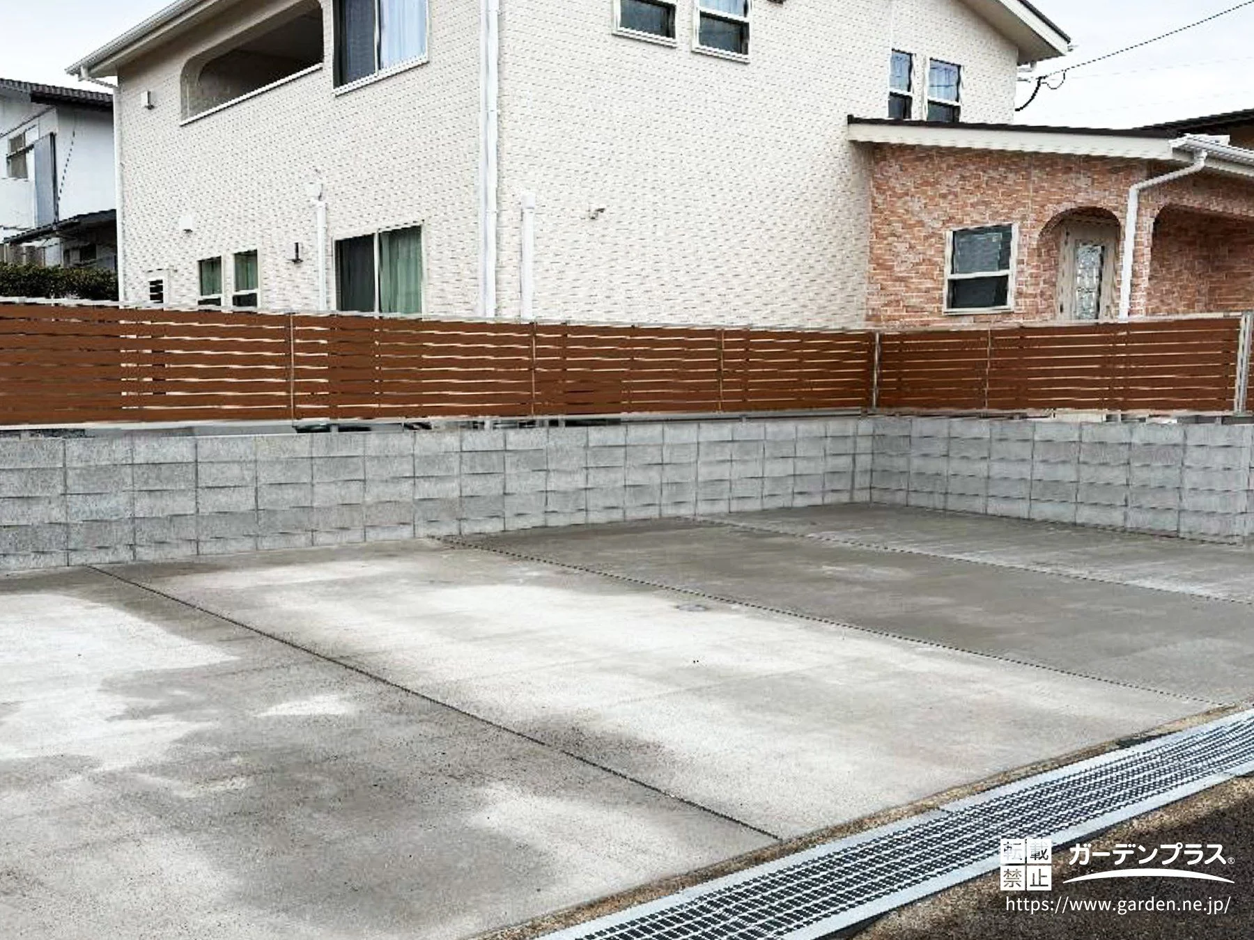 高低差のある敷地を、安心感と使いやすさの両面から丁寧に整えた新築外構です。ゆとりある駐車スペースは車の出し入れや乗り降りがしやすく、毎日の動作をスムーズに支えます。ブロックと木調フェンスで段差をしっかり支えながら、やわらかな外観と調和する表情にまとめました。アンティーク調の門柱はレンガの風合いと響き合い、住まいの雰囲気をやさしく引き立てます。将来アレンジできる主庭の余白まで含めて、「停める・上がる・くつろぐ」が自然につながる、流れの整った新築外構が完成しました。