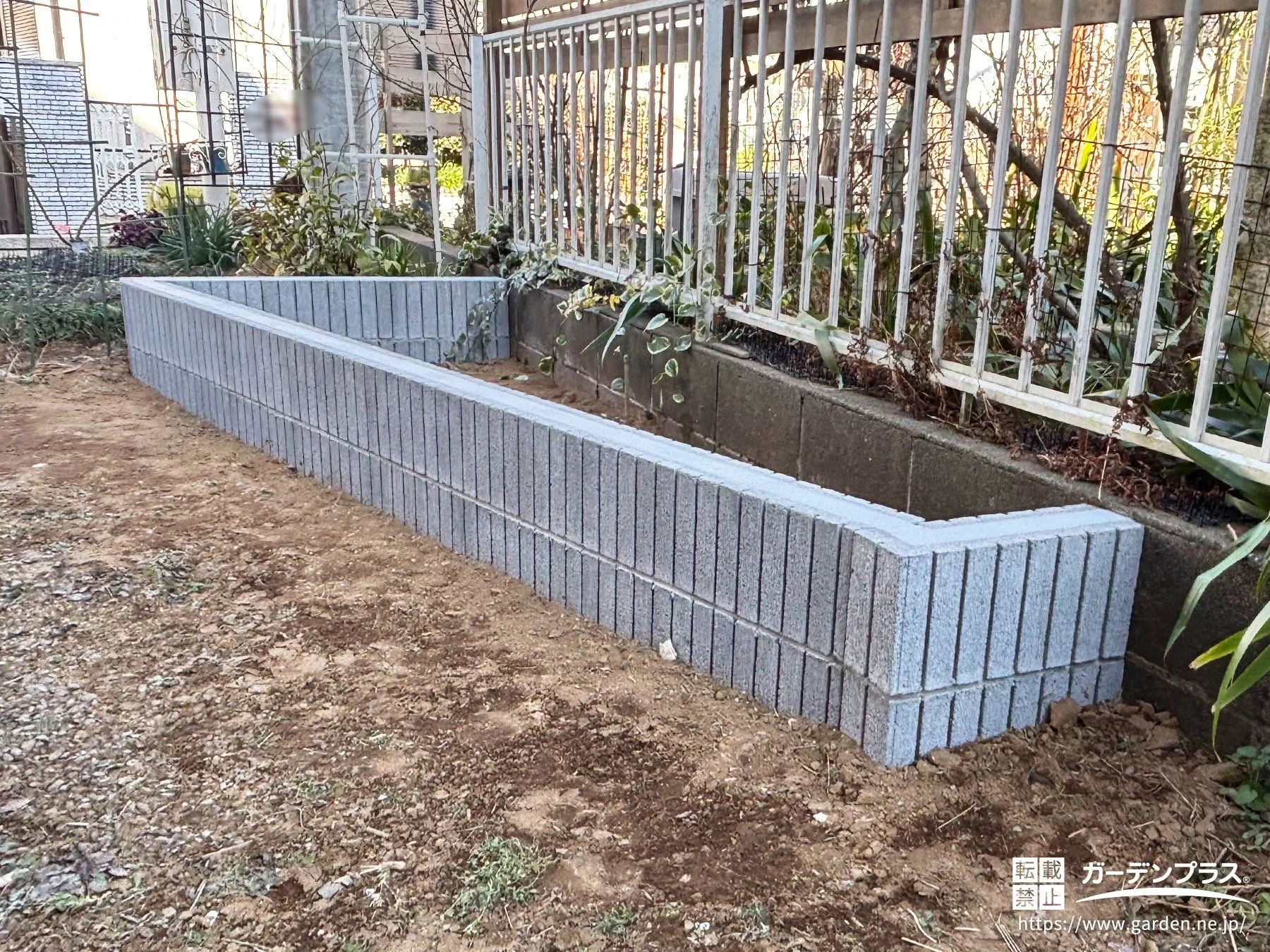 お庭の一画に化粧ブロックを積み、花壇を設けました。縦ラインのデザインがすっきりとした印象です。土の流出をしっかり防止しています。