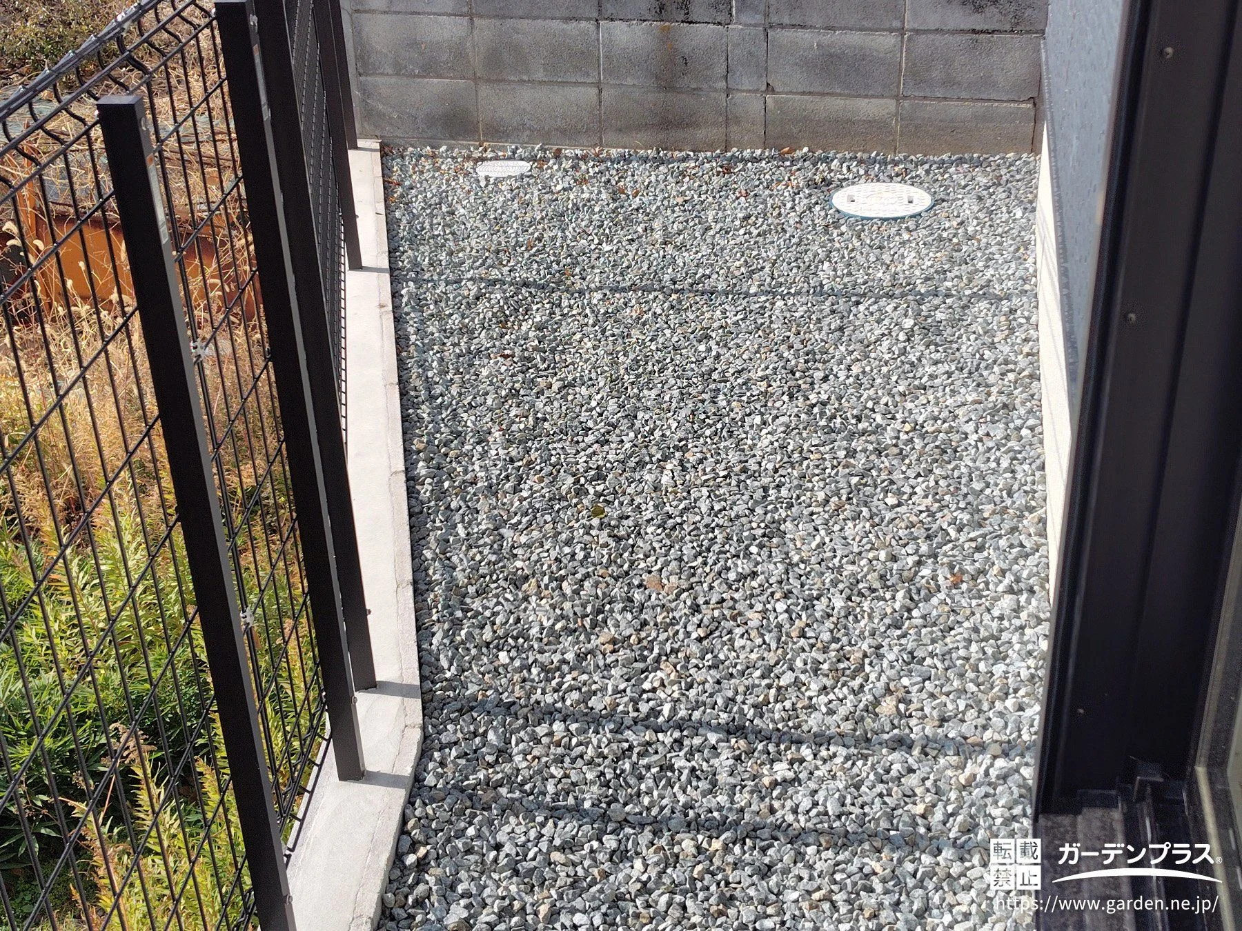 犬走りに防草シートと砂利を敷設して雑草対策をしました。敷地境界にはブロックを積み、上からメッシュフェンスを取り付けています。