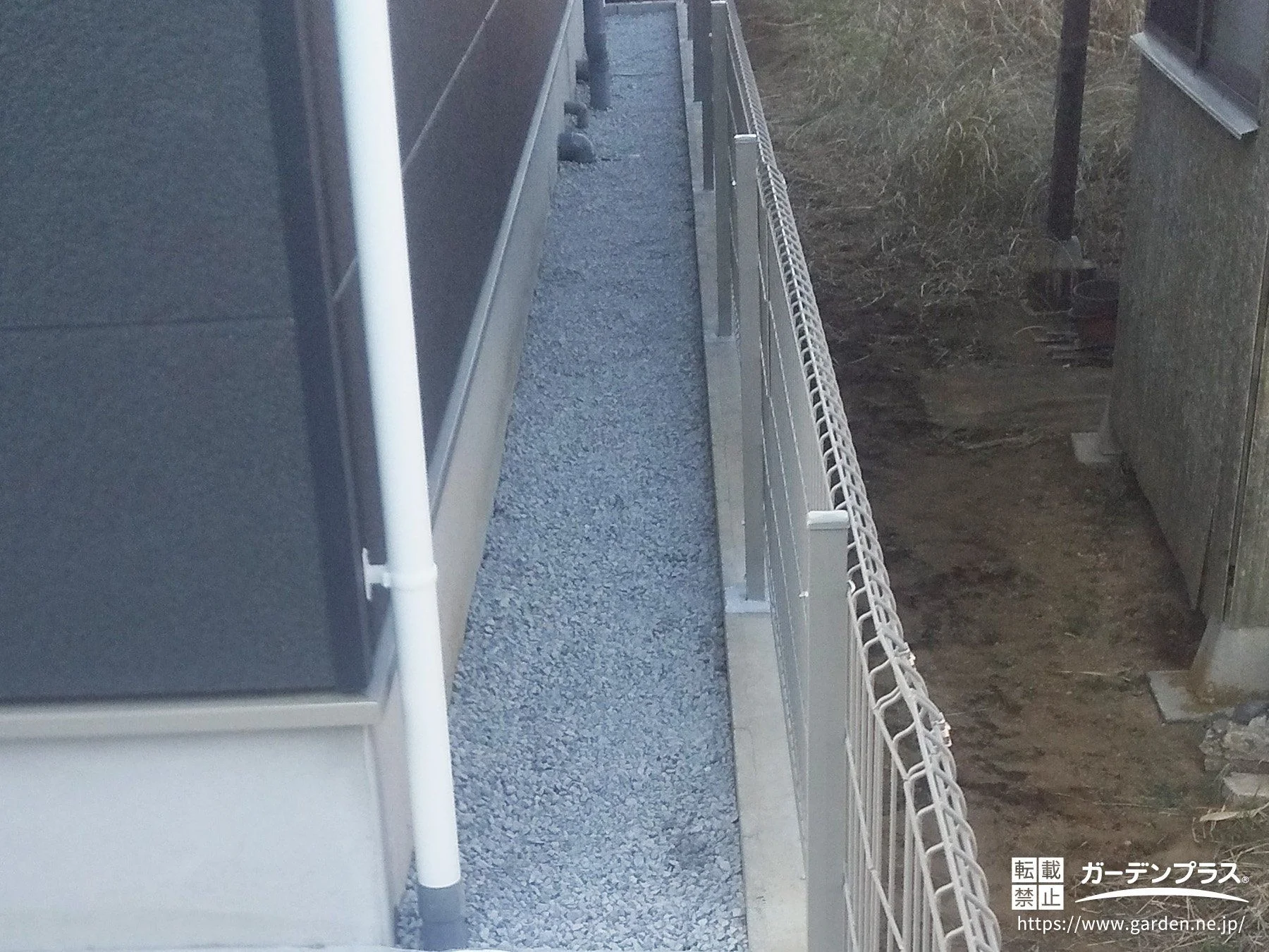 犬走りに防草シートと砂利を敷設して雑草対策をしました。敷地境界にはメッシュフェンスを取り付け、圧迫感を与えずに境界を明確化しています。