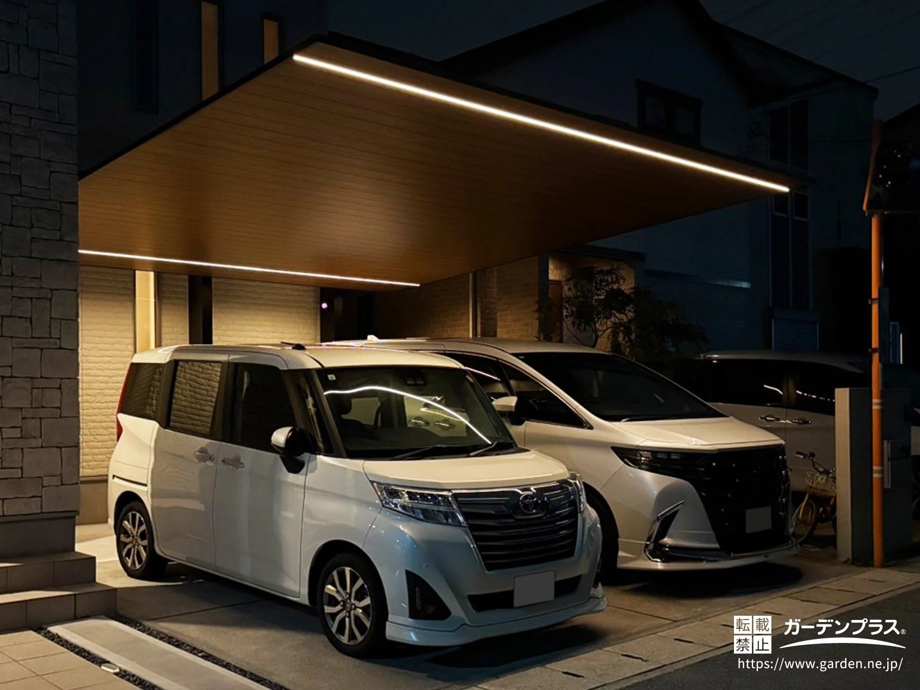 カーポート:LIXIL カーポートSC 後方支持 2台用 木調色 積雪~20cm対応 ブラック×チェリーウッド + LIXIL シームレスラインライト 後方支持2台用 センサ・スイッチなし