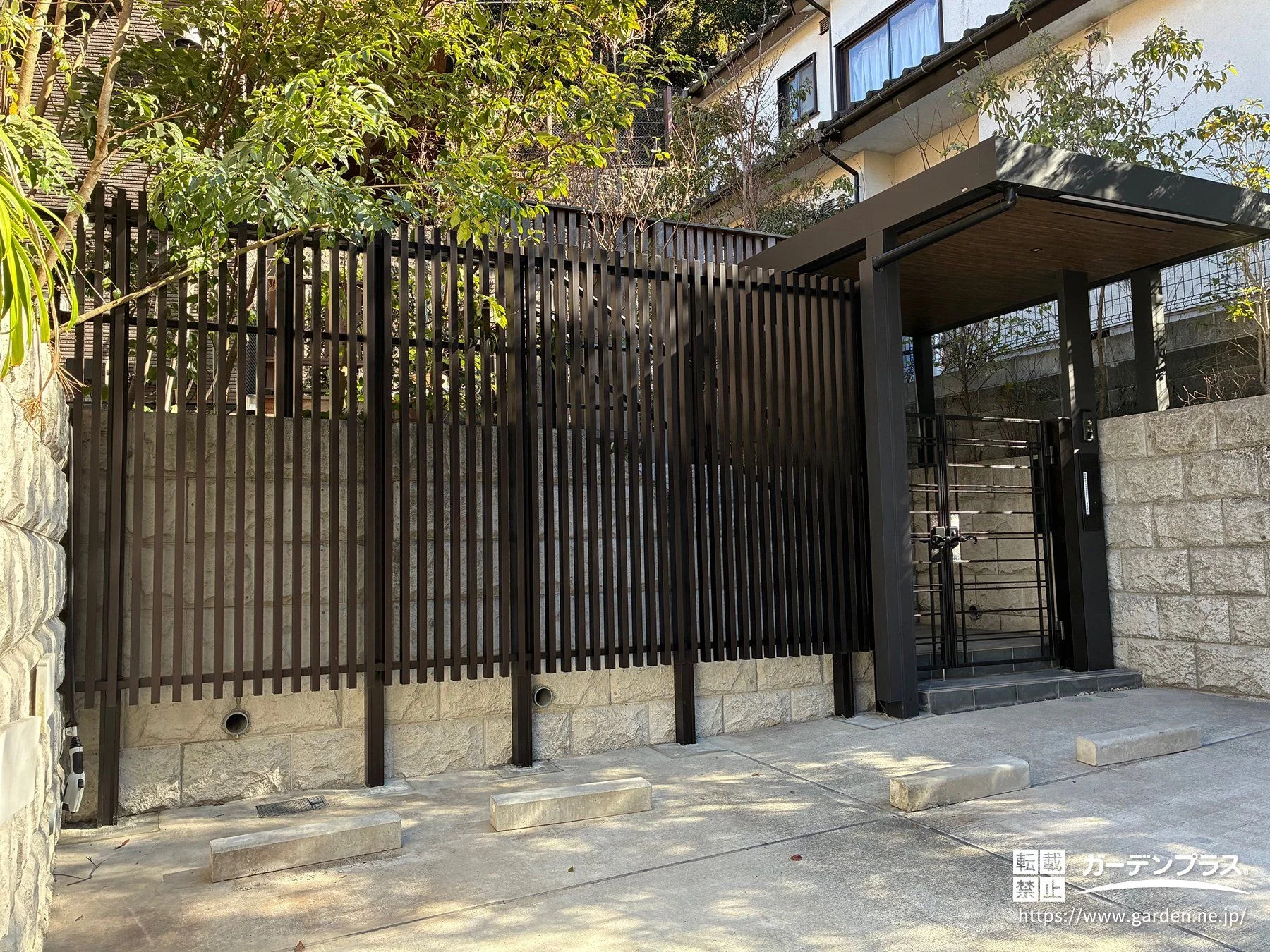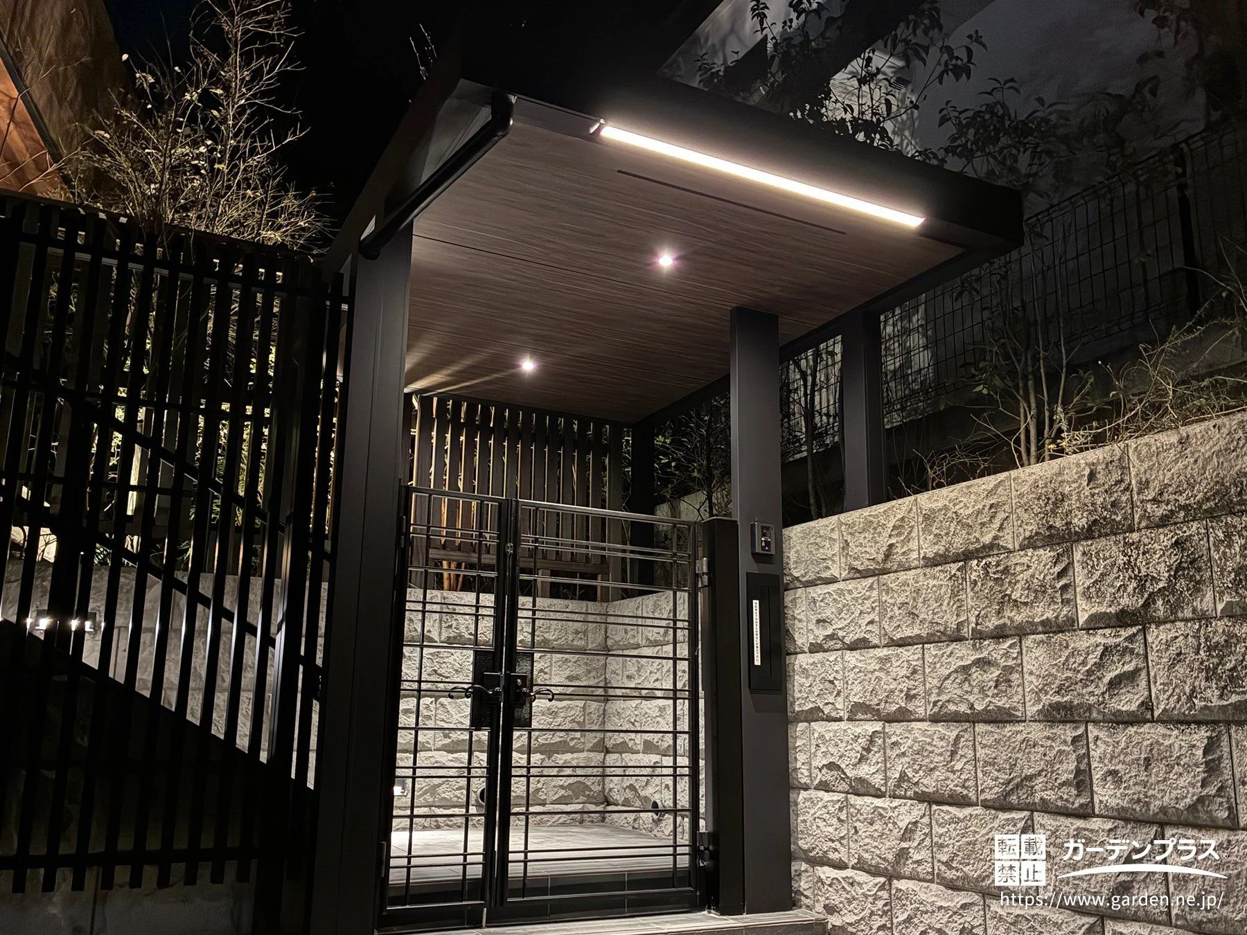 ホームヤードルーフ2オプション:内天井(通気口つき) + ブラウンエボニー + ダウンライト3型 ブラウン + デザイン門柱シンプルS/H24 + 縦型ポスト/前入れ後ろ出し ブラック + スリット格子材 マットブラック