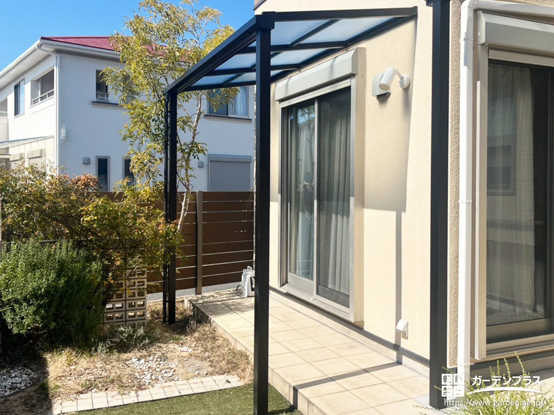 お庭の敷地境界に横板タイプの目隠しフェンスを設置し、外からの視線をしっかり遮りながらも、圧迫感を抑えた落ち着きのある空間に整えました。ナチュラルなブラウンカラーが植栽ともなじみ、お庭全体にあたたかみをプラスしています。掃き出し窓の前にはテラス屋根を設け、雨の日でも気軽に外へ出られるスペースに。洗濯物も干しやすく、急な天候の変化にも対応できる実用性の高い空間となりました。さらに既存の駐車スペース横に土間コンクリートを打設することで駐車スペースを拡張。お車の乗り入れや切り返しがしやすくなり、日々の使い勝手も向上しています。プライバシーの確保や日常の使いやすさをバランスよく取り入れた、暮らしに寄り添う外構の完成です。
