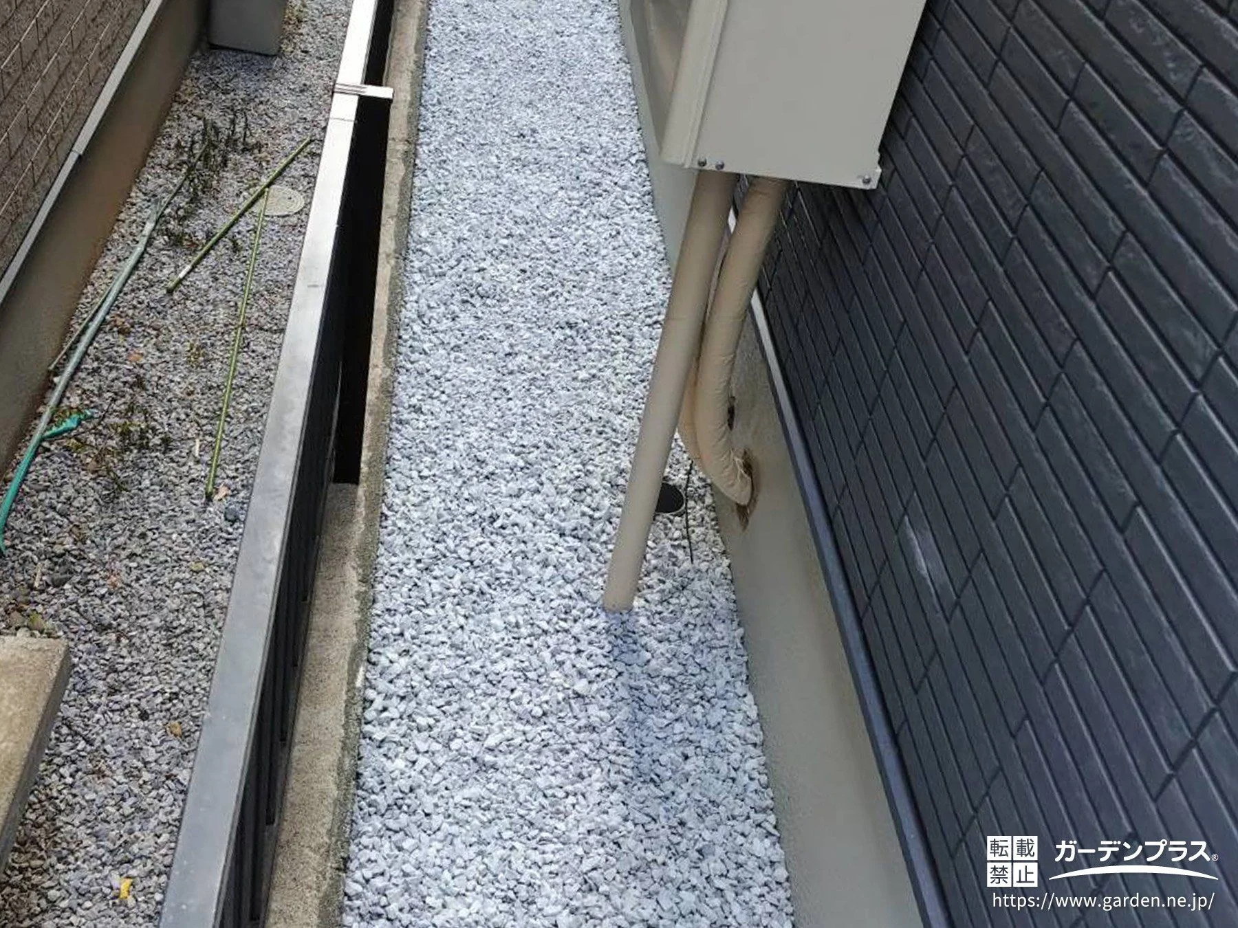 犬走りに防草シートと砂利を敷設しました。雑草の発生を防ぎ、日々のお手入れが快適です。