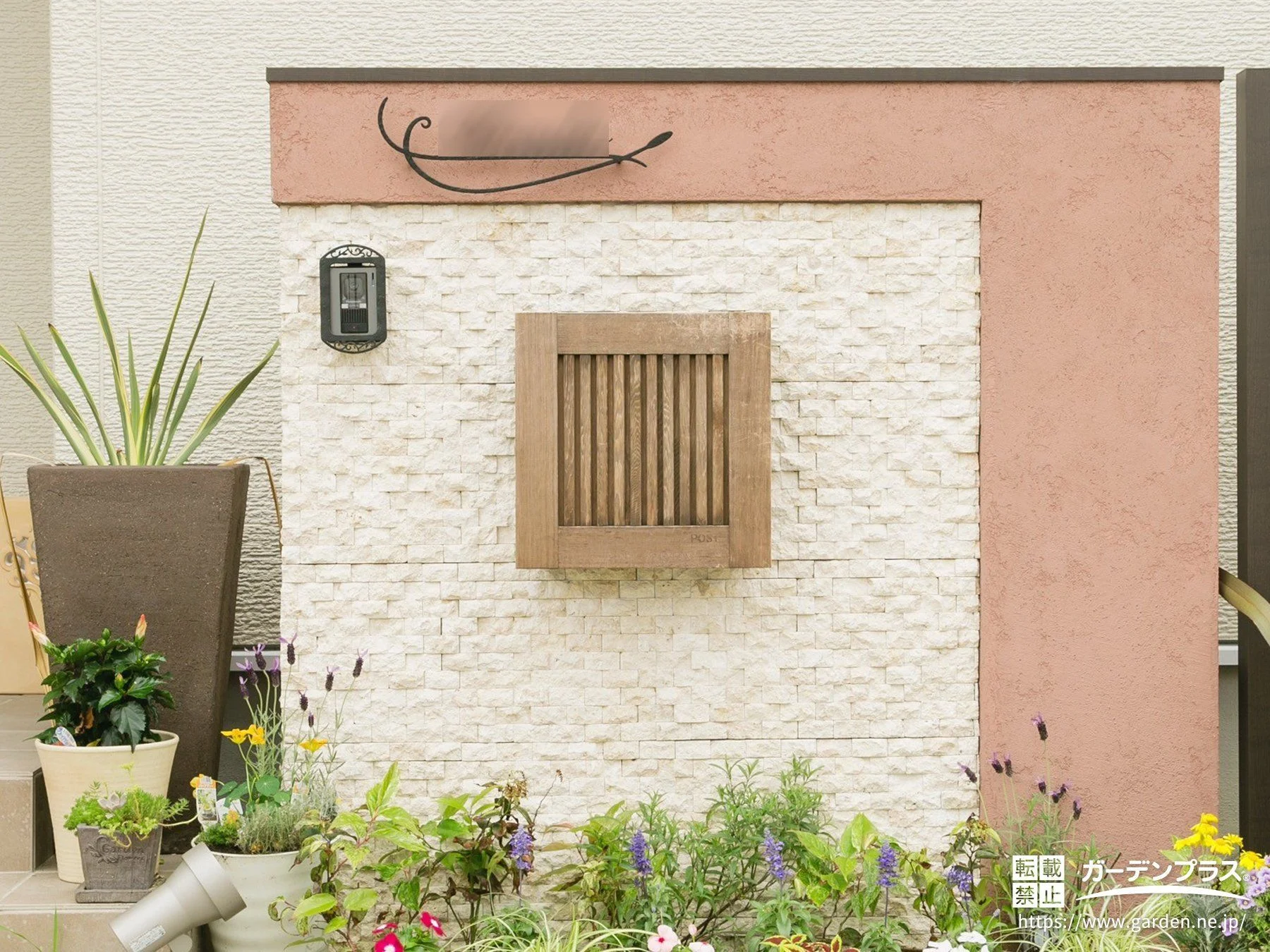 お家の屋根や外壁の雰囲気に合わせて、門柱にもコーラルピンクの差し色を加えました。