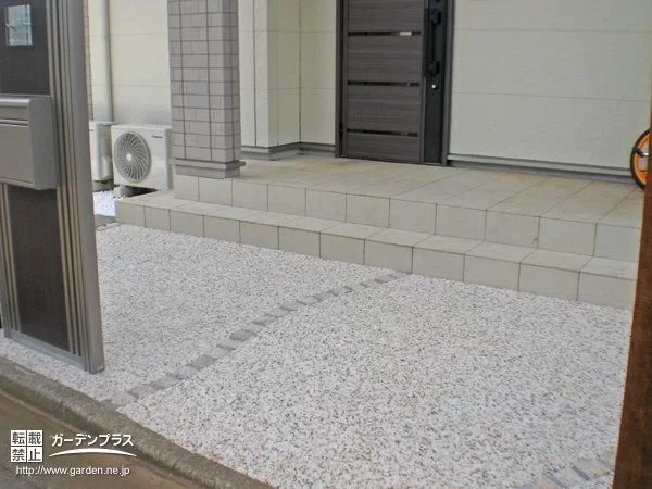 玄関アプローチ:除草シート+白玉砂利5分 DCSファイバー仕上げ + 見切りピンコロ入れ