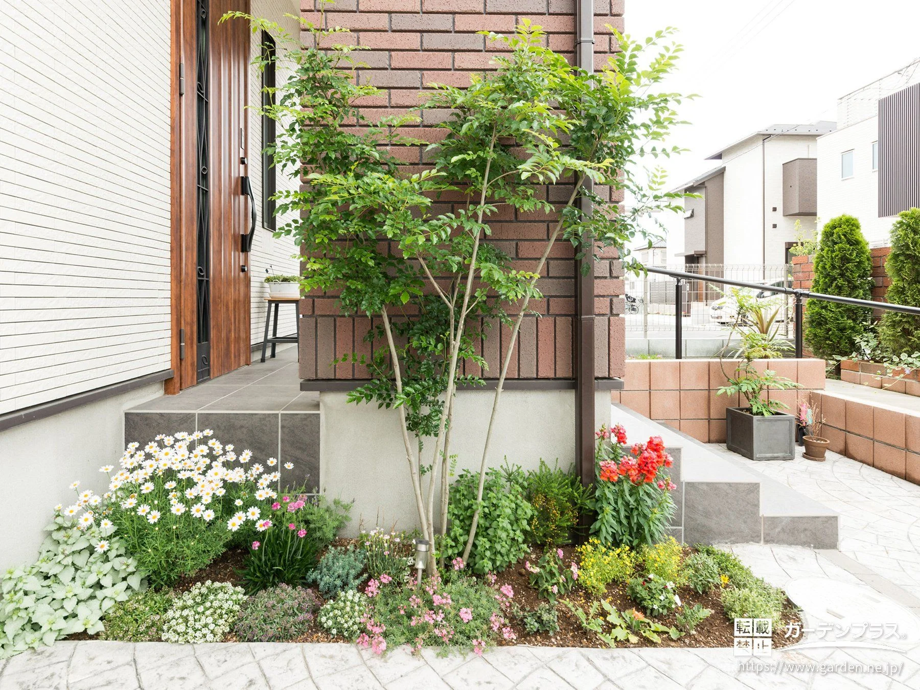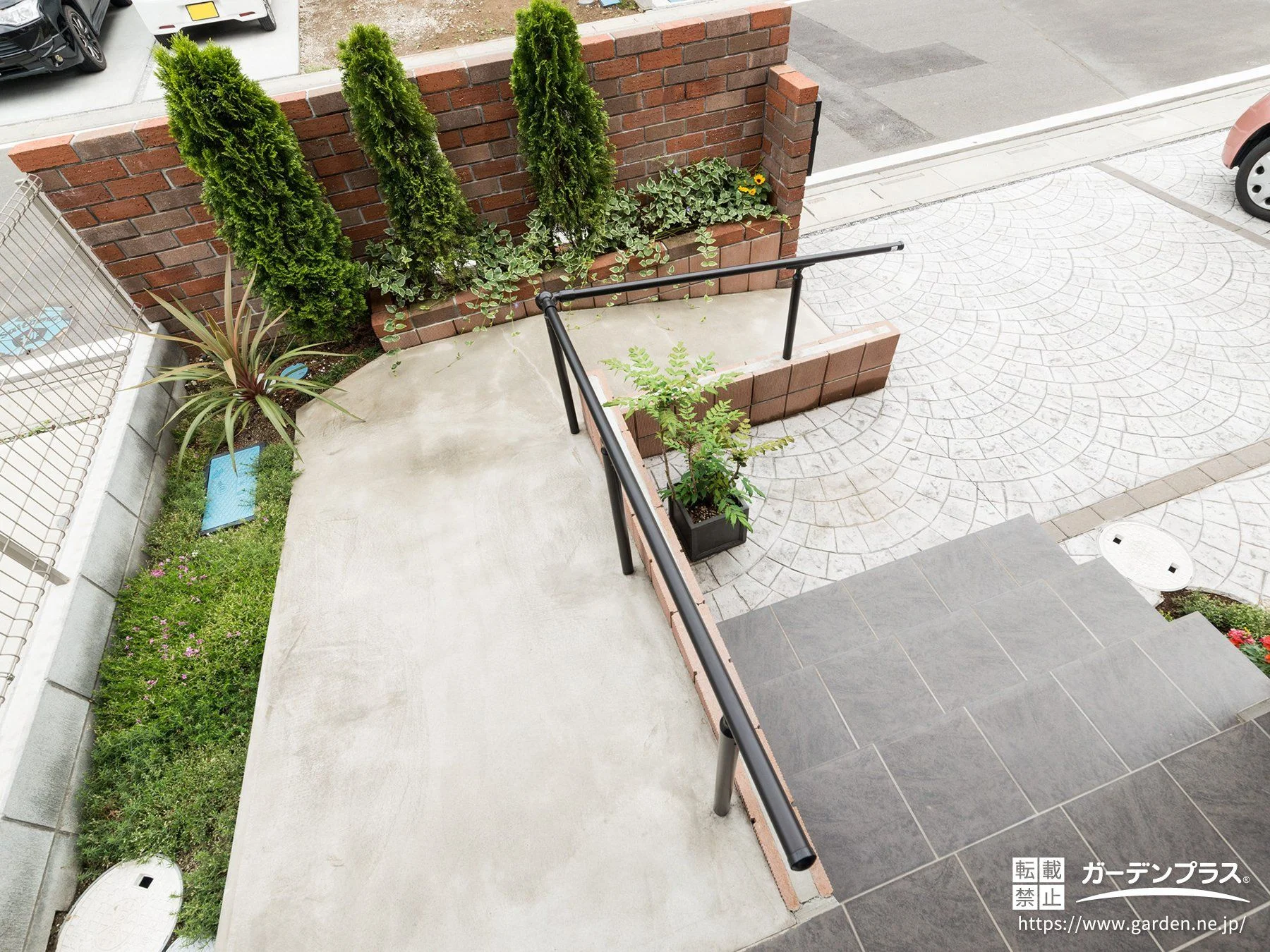 門柱の裏側には手すり付きスロープと花壇を施工。利便性とデザイン性を兼ね備えた仕上がりです。