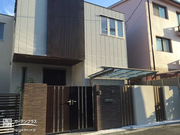 白とダークブラウンのお色が美しいスクエアデザインのご自宅のファサード工事を承りました。門扉や門柱は建物の配色に合わせて高級感のあるダークブラウン系統の色に合わせました。 ご自宅のイメージをそのままに、風格のあるクローズ外構のデザインです。