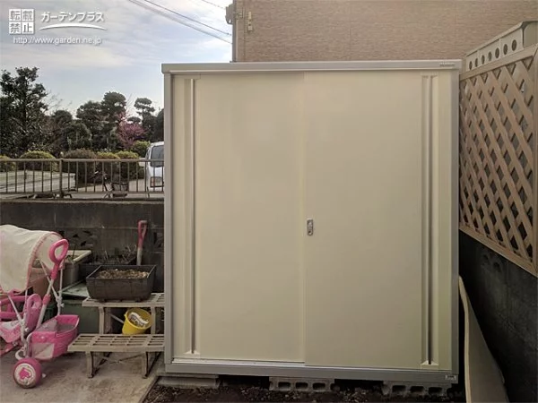 庭先に置くと便利なフレンドリーホワイト色の小型物置を設置。耐久性・収納性に優れ、新開発のプッシュロック錠も付いているので防犯性にも優れています。