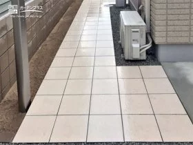 タイルテラスと目隠しフェンスの設置のご依頼を承りました。明るい色合いのタイルを敷設したアプローチに光を取り込む目隠しフェンスを設置、モダンなデザインの可愛らしい印象に仕上がりました。