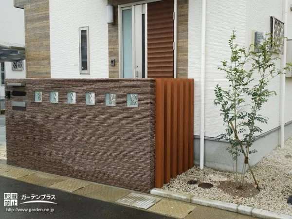 門柱: コンクリートブロック + タイル + ガラスブロック