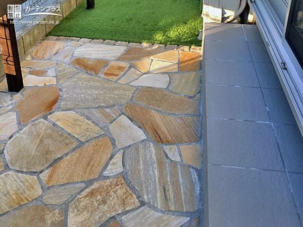 お庭の雑草対策に、見栄えが美しく天然芝のような人工芝と、明るい色目の石英岩の乱形石張りを敷設しました。ダークウッドの物置がナチュラルさを演出するオシャレなお庭に仕上げました。