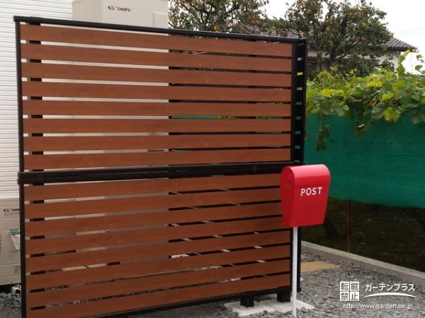 木目調の目隠しフェンスを設置しました。木の風合いのフェンスを採用。ブラックフレームと木目がおしゃれにしっかり目隠しをします。