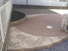 新築外構一式工事を承りました。駐車スペースは土間コンクリートを打設しカーポートを設置。また、アプローチはカラーコンクリートや化粧平板、レンガで彩りをプラスしました。あたたかみのある色合いで統一し、アールのデザインが柔らかく優しい表情をのぞかせます。