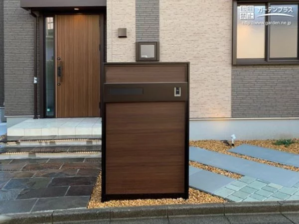 機能門柱を設置しました。木目調のモダンデザインのものをセレクト。黒とダークブラウンの木目調がモダンな印象で落ち着きのある佇まいです。