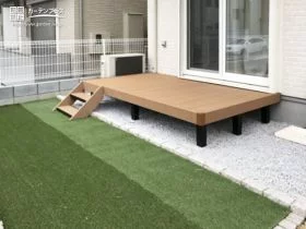 テラスにウッドデッキを設置しました。デッキ下には砂利を敷いて雑草対策を。人工芝が魅力たっぷりの青々としたお庭を演出します。
